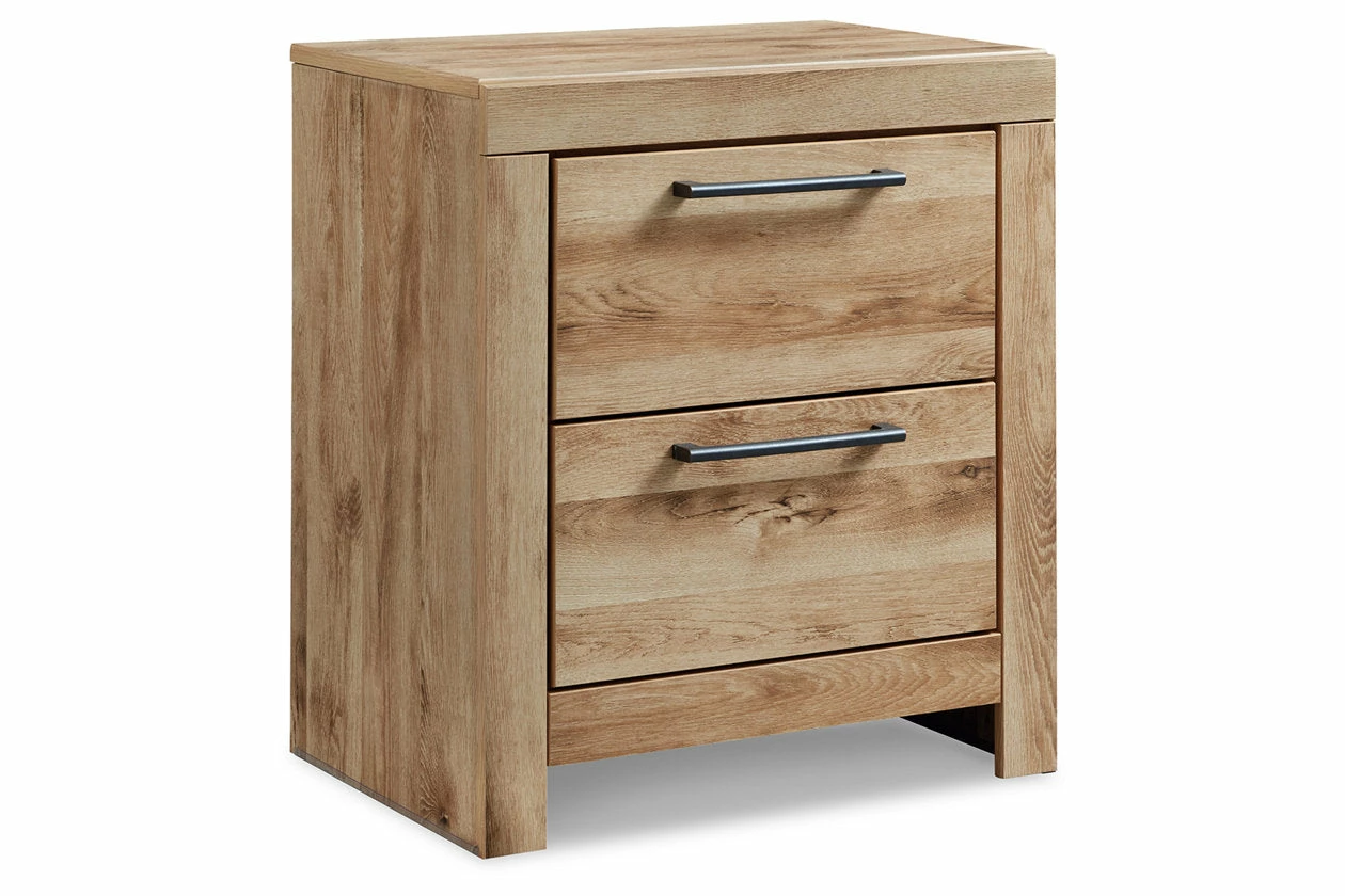 Inspired by natural beauty, refined to perfection. This nightstand brings cozy outdoor vibes to your bedroom with its warm and inviting golden rustic finish. Antiqued gunmetal handles adorn the two drawers on its framed front for an industrial touch, while USB charging adds a high-tech element to the simple, streamlined design.
