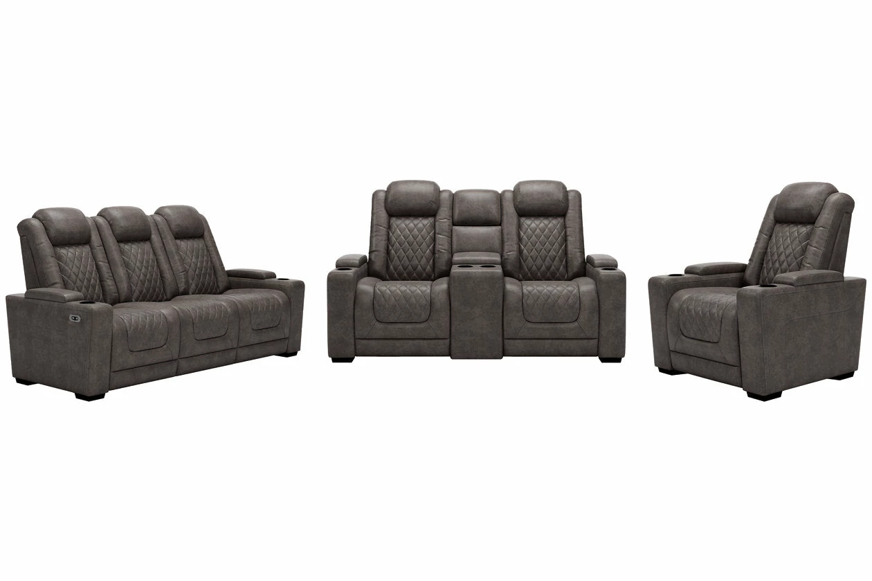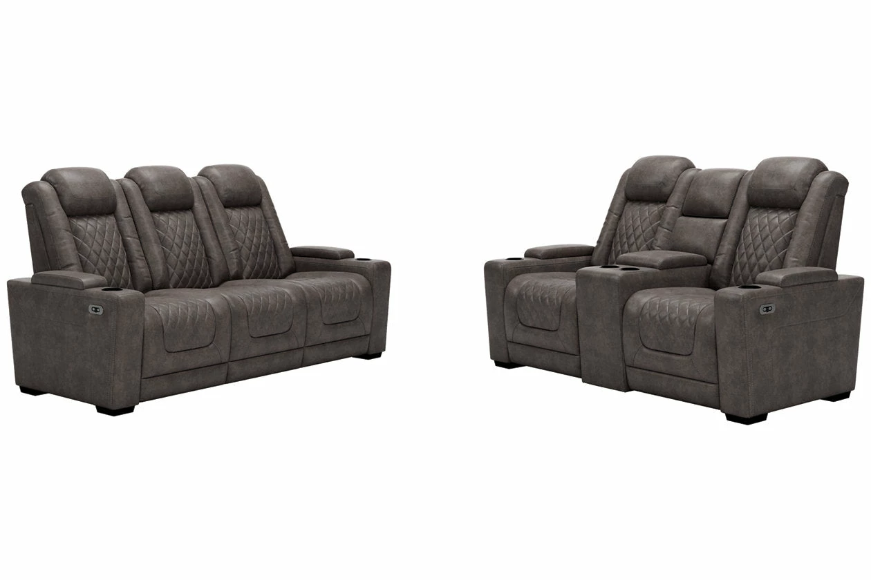 This power reclining package is proof of just how far recliners have come when it comes to form and function. Ultra cool and contemporary in trendy gray, this fully loaded set makes it so easy to make home your haven. Dressed to impress with diamond stitching inspired by sports car interiors, it’s covered in a fabulous faux leather with pebbled effect for authenticity. High-tech advancements include a one-touch power control with Easy View™ adjustable headrest and USB plug-in.