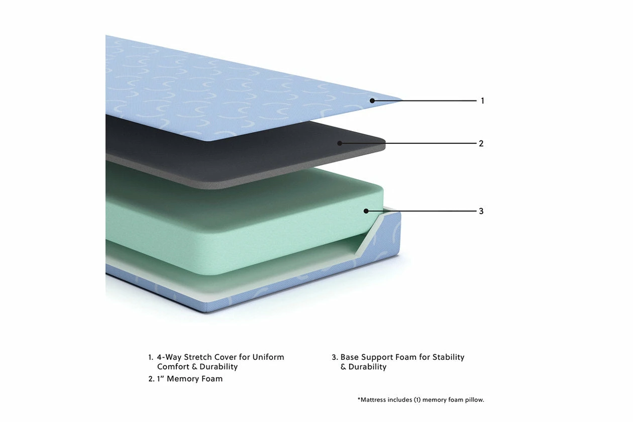 Sleep soundly knowing your kids do, too. This twin mattress provides the rest they need to navigate the day, from schooltime to playtime. No need to count sheep—memory foam and a support core keep your child comfortable as they drift off. A snuggly soft yet supportive pillow makes for sweet dreams.
