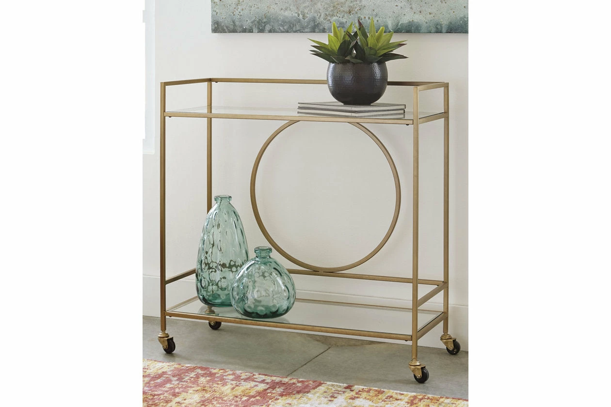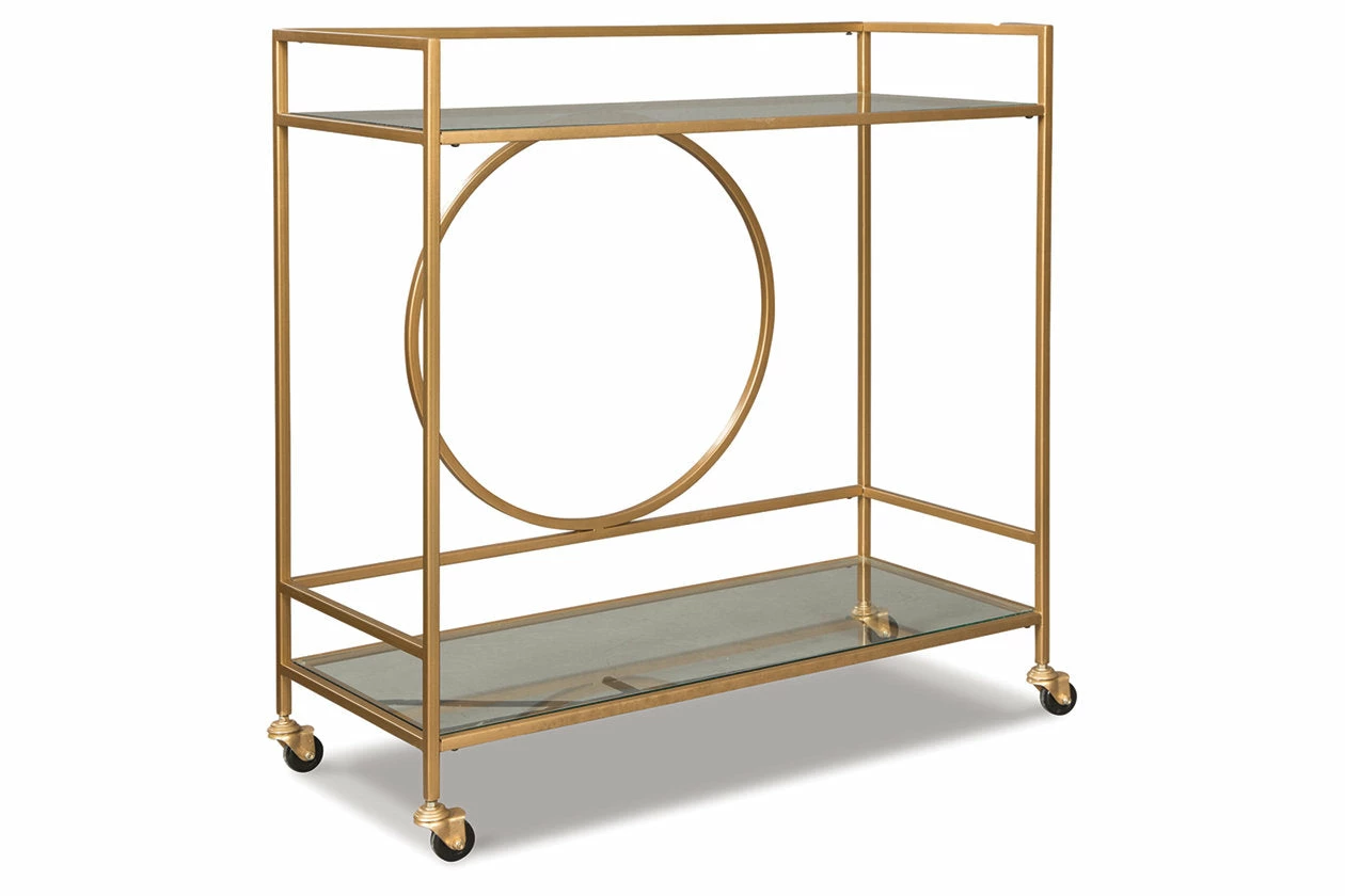 Cheers to this simply chic bar cart for maximizing the art of minimalism. Clear glass tabletop and shelf infuse a floating-on-air quality. Antiqued goldtone finish gives the sleek metal such an upscale look and feel.