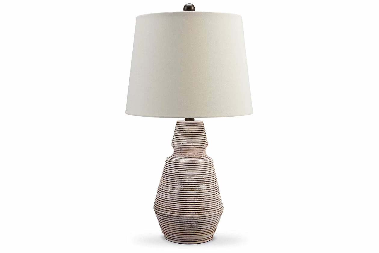 Add an impressive design element to your home with this table lamp. The distressed resin body in brick red and white is topped off with a crisp, fresh fabric shade. Low profile yet eye-catching, this lamp makes a gorgeous accent for contemporary and mid-century modern spaces.