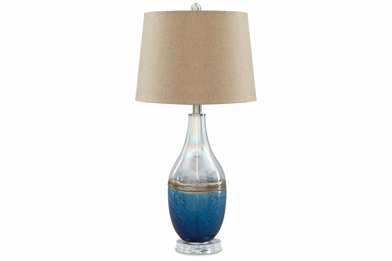 This table lamp embraces artful nautical living. Elements of the coast are reflected in the sea glass-inspired base. Textural ocean blue and sandy brown banding are reminiscent of where water meets land. At the right angle, light reflects a rainbow through the clear portion of the base. Tan drum shade completes the relaxing appeal.
