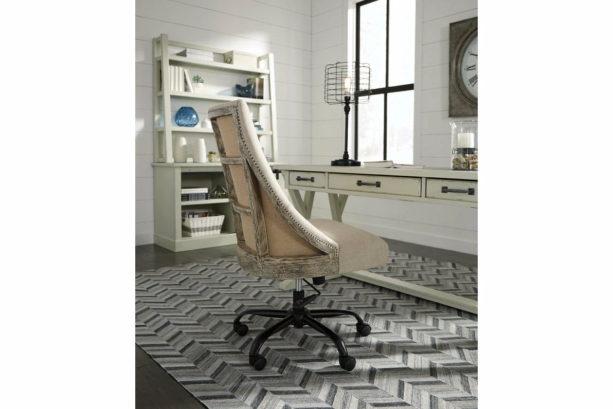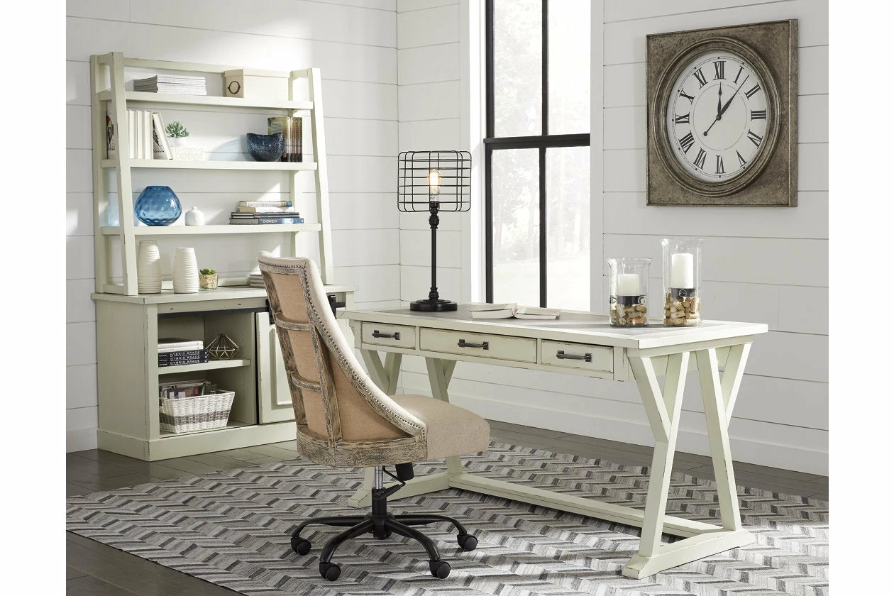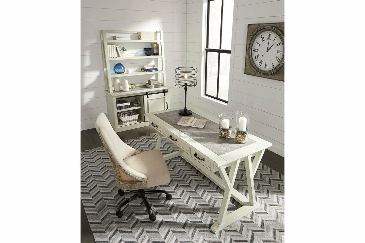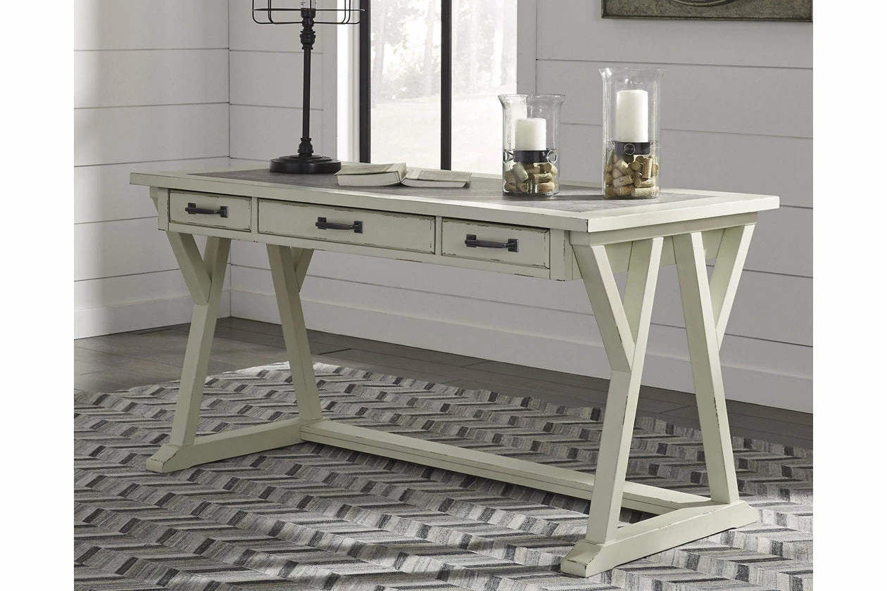 Can’t decide between farmhouse or industrial style? Make a striking compromise with this home office desk. Generously scaled and loaded with charm, it includes a trio of smooth-gliding drawers to help you stay organized. Faux cement top adds another layer of interest.