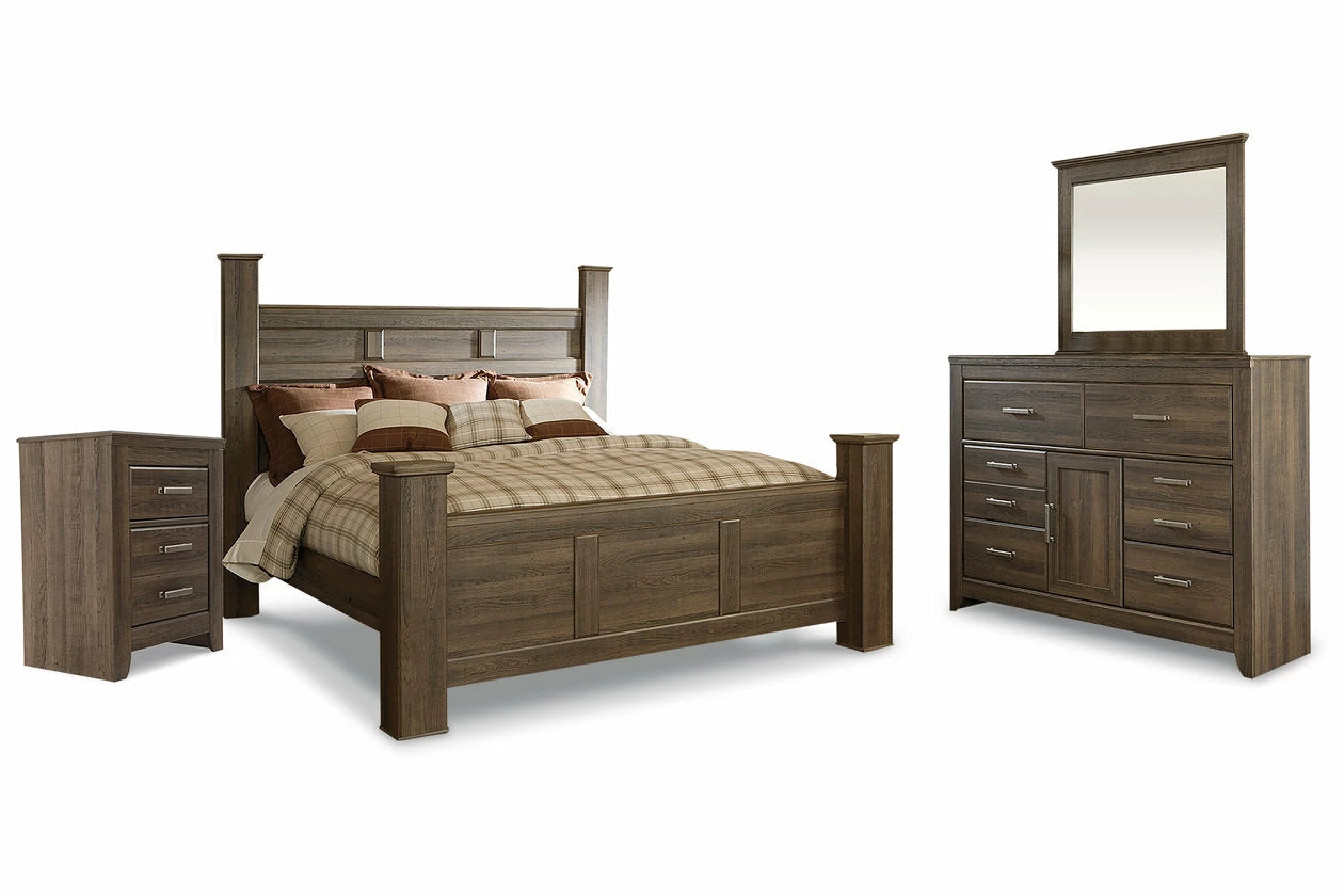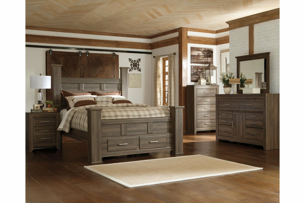Get the look of posh barn wood without setting foot in a salvage yard with this bedroom set with queen poster bed, two nightstands and dresser with mirror. Replicated rough-sawn oak finish has a vintage feel reminiscent of a timeworn family heirloom. Warm, rustic and naturally beautiful, it’s just got that ageless appeal. Sleek hardware in a pewter tone lends a snappy finishing touch. Mattress and foundation/box spring available, sold separately.