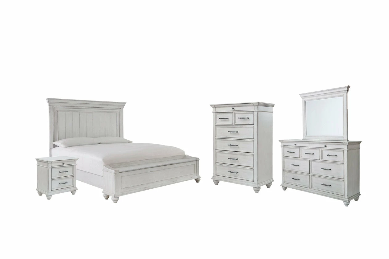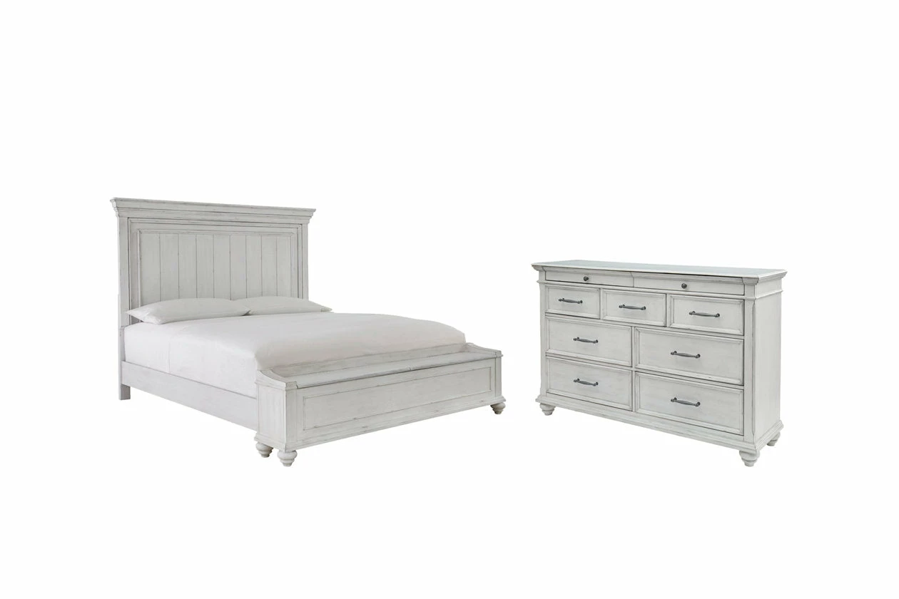 Give your retreat vintage charm with this bedroom set in a beautifully distressed whitewash finish. You’ll love the headboard’s grand style featuring a picture framed panel. The bench footboard is equally elegant offering extra storage and a convenient seat. Generously scaled moulding, framed drawer fronts and bun feet enhance the character of this bedroom set—evoking the feel of a quaint cottage escape.
