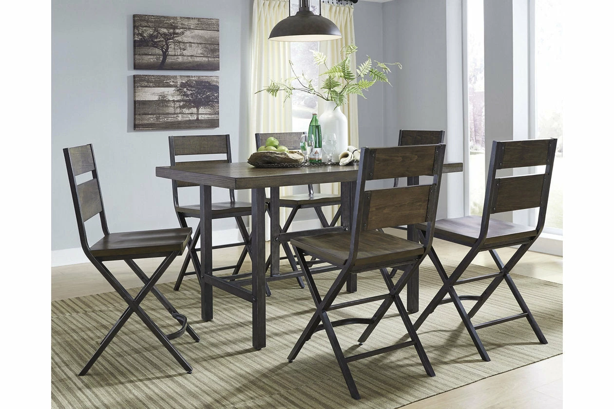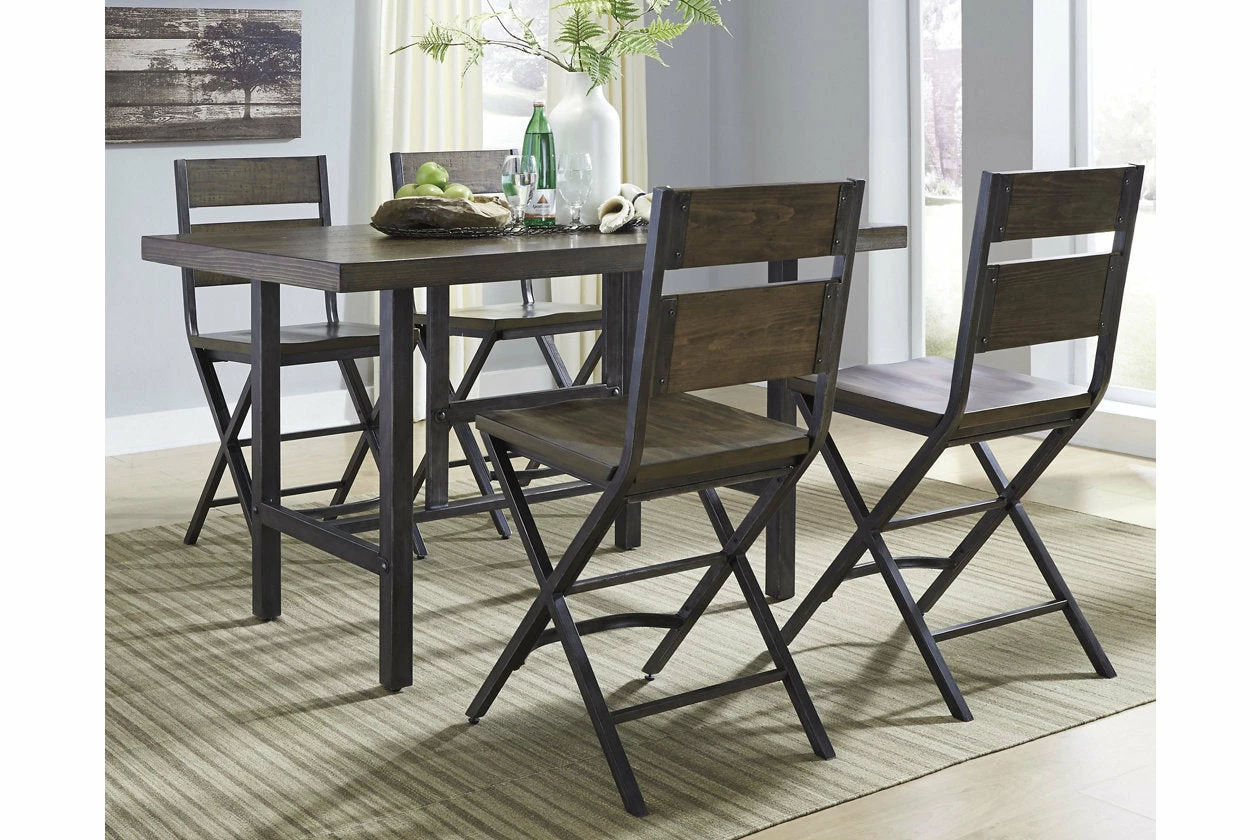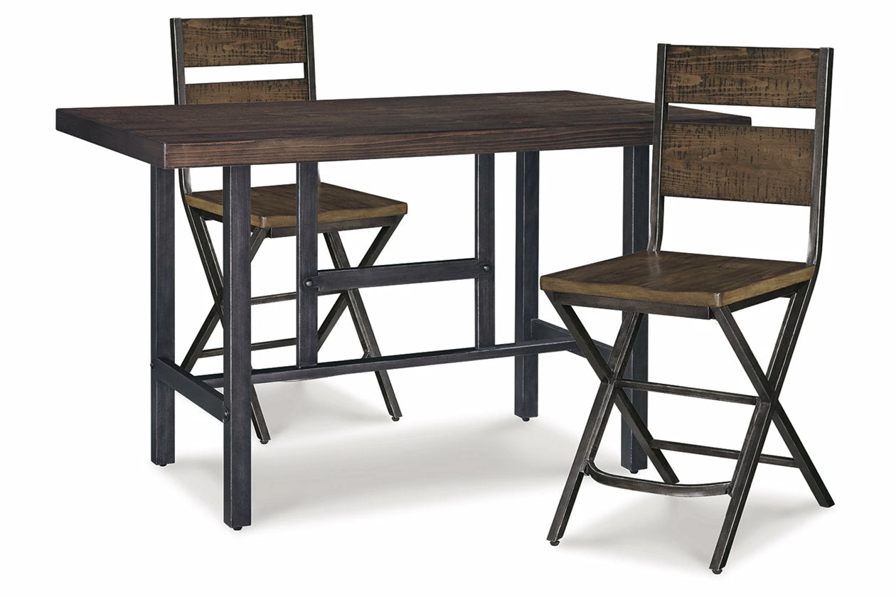This timeless counter height dining set elevates industrial-chic style in such a tantalizing way. The table might look naturally weatherworn, but the replicated design provides the strength and durability of modern materials. This set’s smaller scale is ideally suited for high-style homes that are short on space. The counter height bar stools are constructed of metal and wood with a crisscross leg design and slat ladder backs. They feature contoured seats, adjustable levelers and foot rests for a comfortable dining experience.