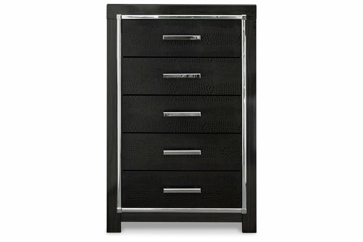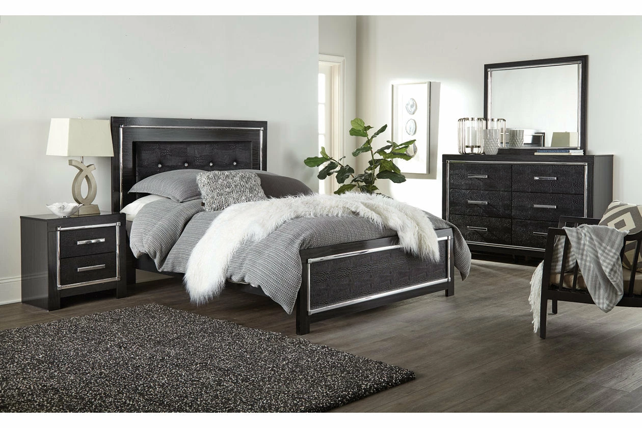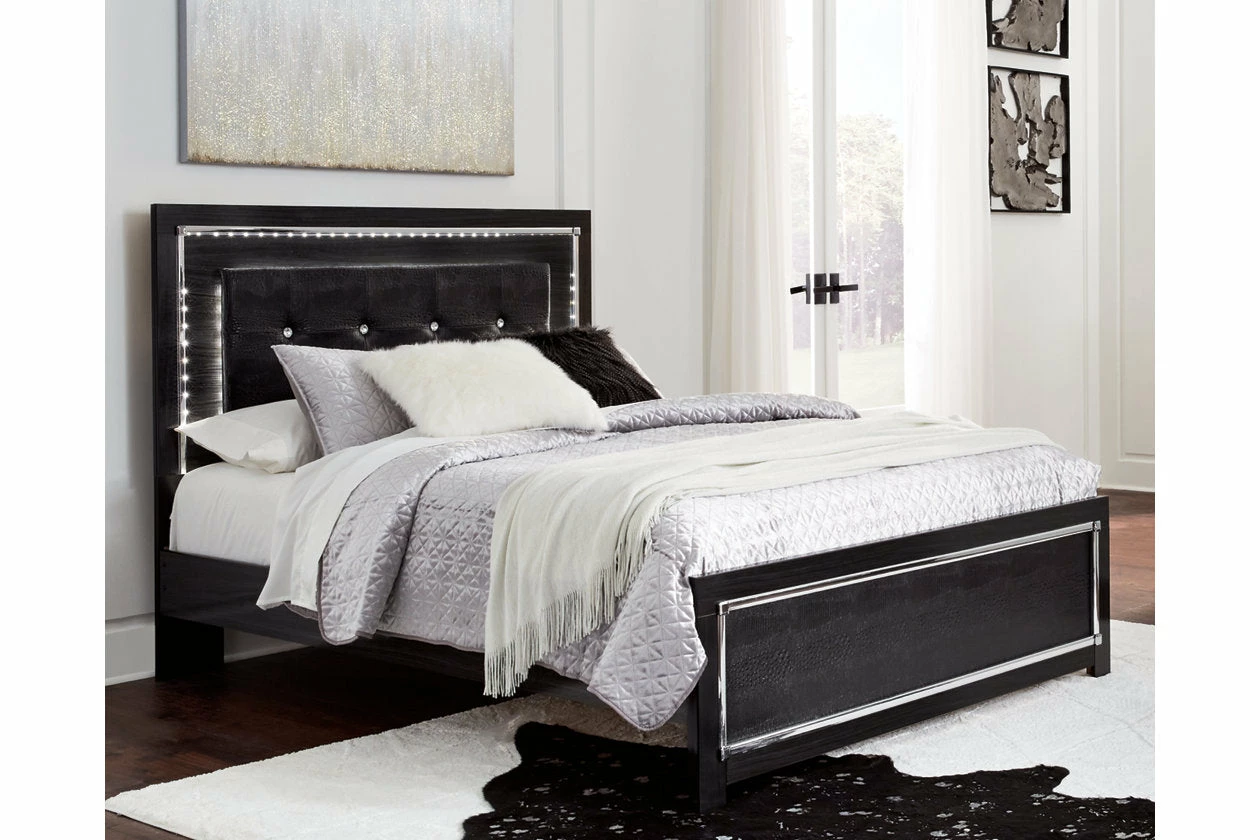 Rest easy. The luxurious look you’ve been dreaming of is yours for the taking—at a price sure to put you at ease. This queen panel bed brings a sense of old Hollywood with a contemporary flair. A deep, dark finish and faceted chrome-tone accents exude Hollywood-chic style to the max. Padded windowpane stitching on the sleek black upholstery infuses a sumptuous look that’s upscale and indulgent, and utterly on trend.
