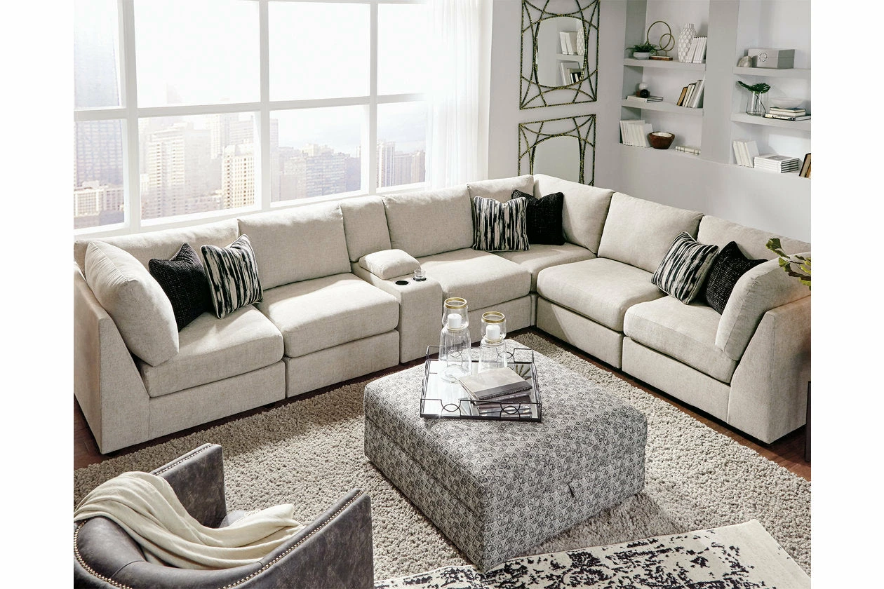 With its casual-contemporary aesthetic and modular design that simply makes sense, this sectional and ottoman make way for high style and indulgent comfort. Rest assured, the thickly cushioned storage console includes not only a pair of cup holders, but also a USB port to keep you powered up while you unplug. Wedge-cut armrests are right on point for those who fancy a clean, modern look. The storage ottoman’s cushioned, removable top reveals loads of hideaway space for seasonal storage or last-minute cleanups, and the generous scale makes it ideal as a center table or footrest.