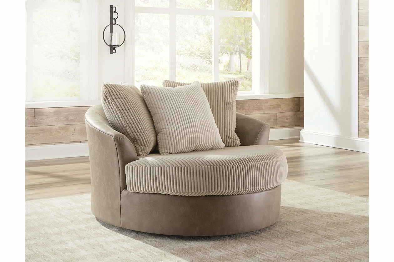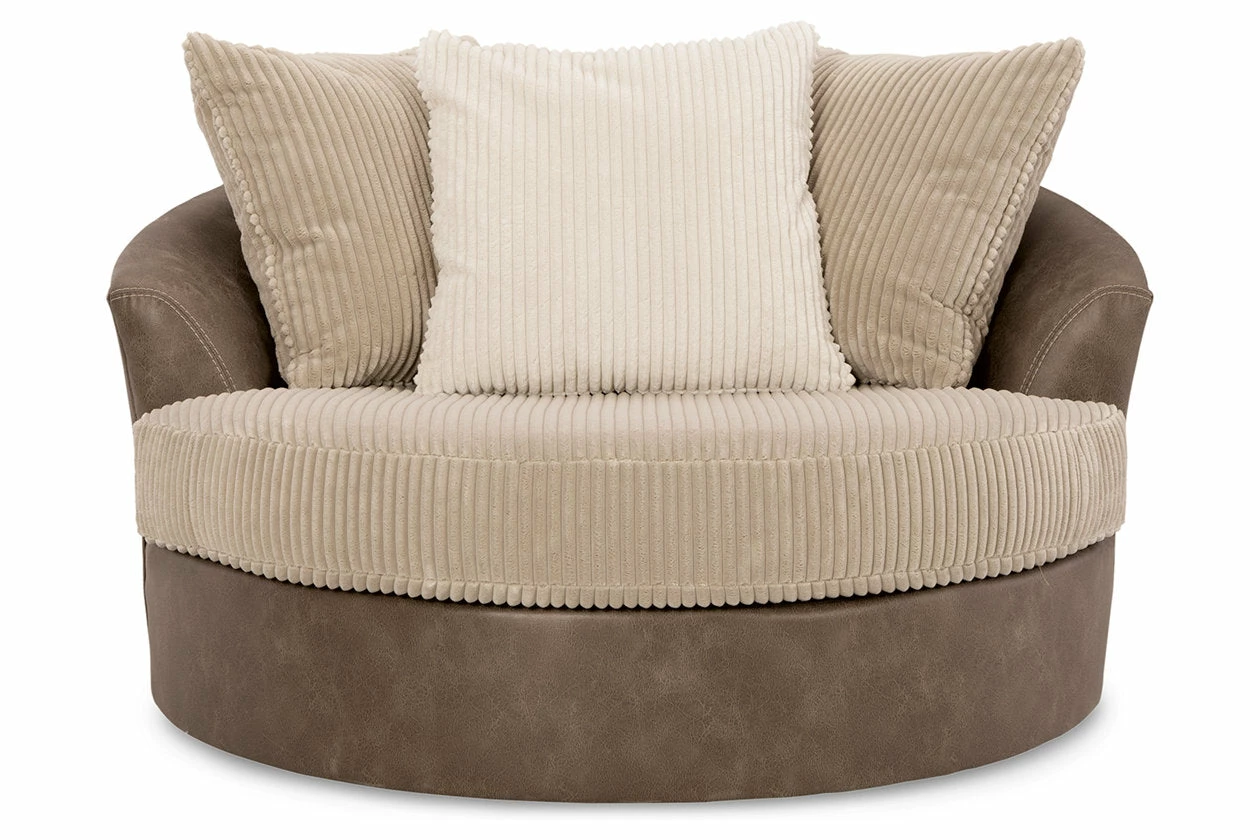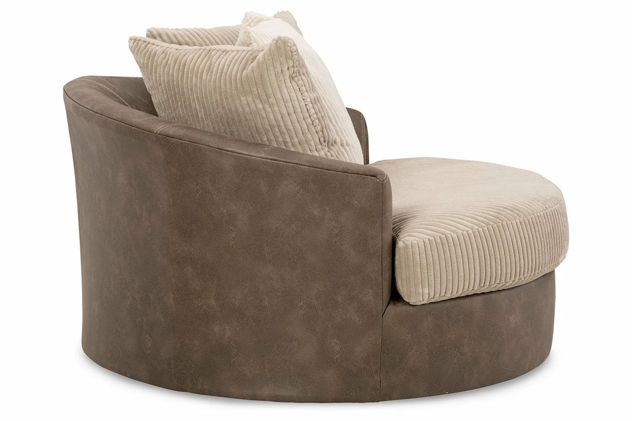 Sink into extraordinary comfort on this oversized swivel accent chair. Bigger and deeper, the cozy corduroy cushion complements rich brown faux leather that is comfortable and visually appealing. Go ahead, sit back and unwind. There’s room for cuddling or stretching out solo with room to spare. The neutral hues blend easily into your decor for a head-turning addition to your home.