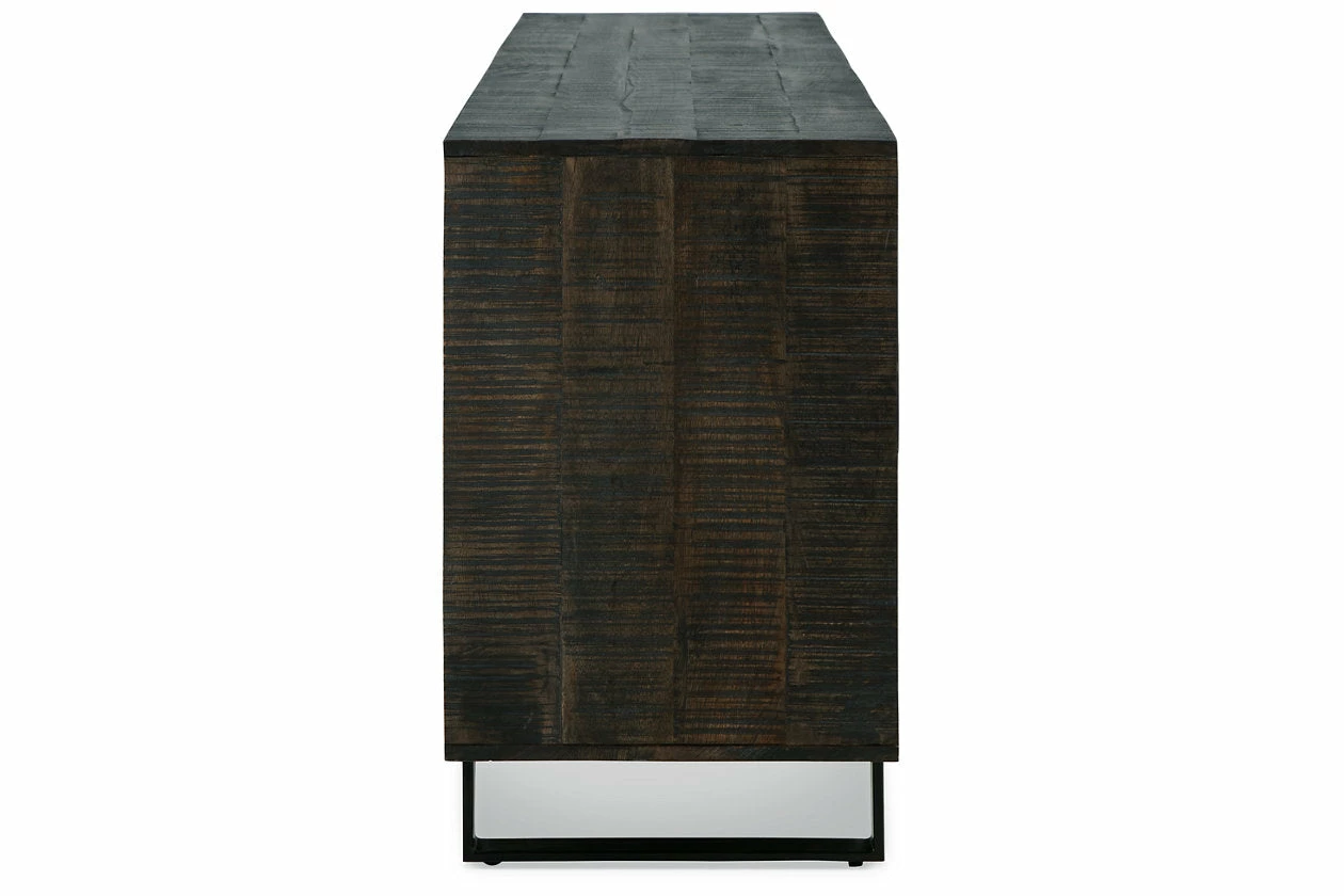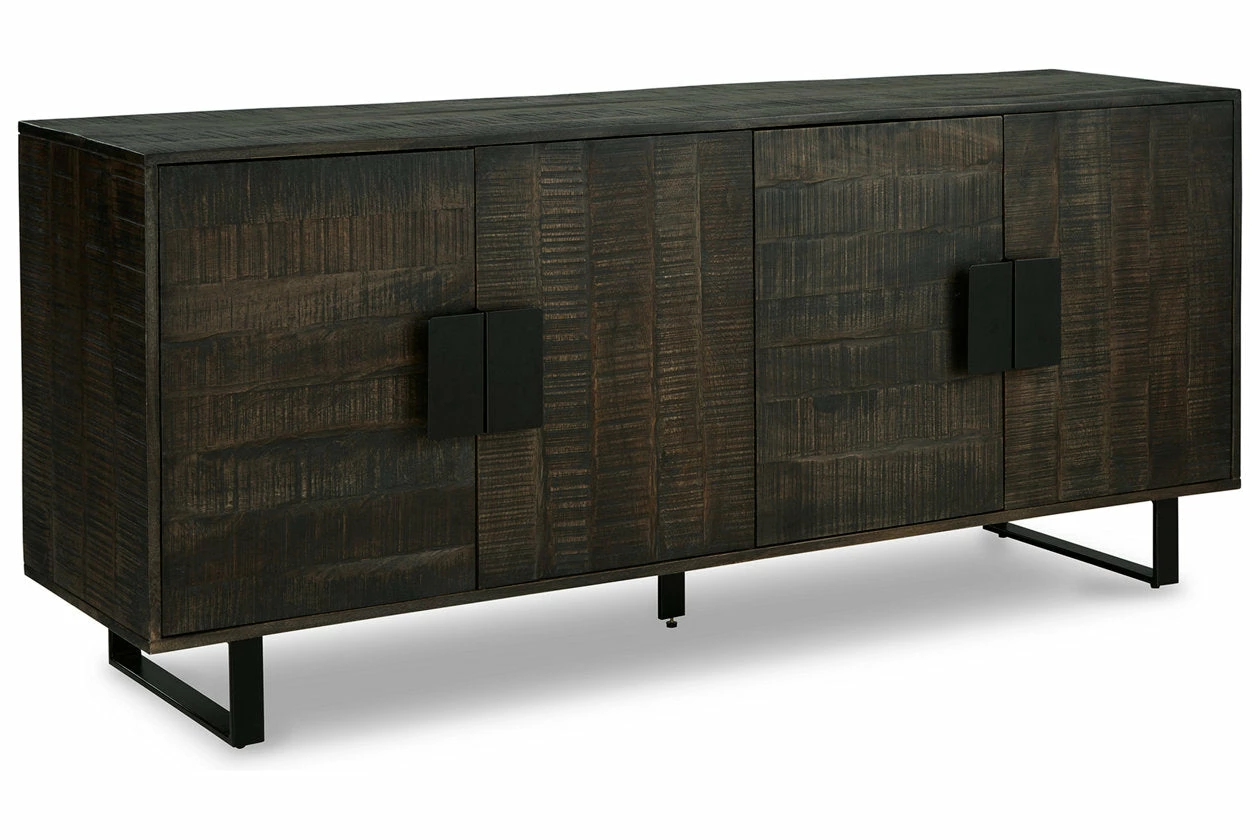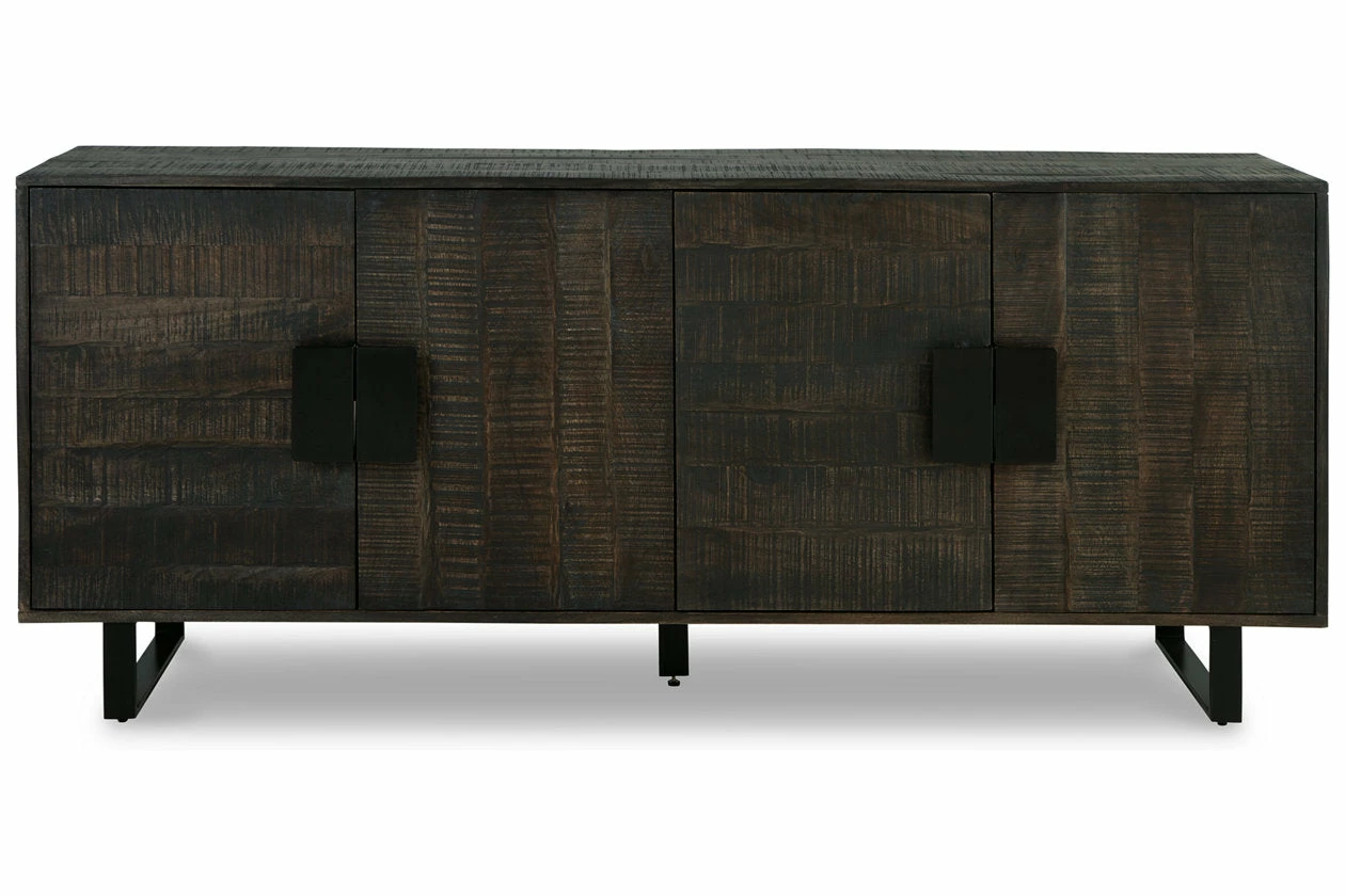 This accent cabinet has a mixed-material look that seamlessly slips into any contemporary scene. It impresses with the raw beauty of its saw mark effect and grayish brown glaze. Sleek black metal hardware provides visual balance. With two shelves behind the pair of double doors, this piece gives you storage and superior style all in one.