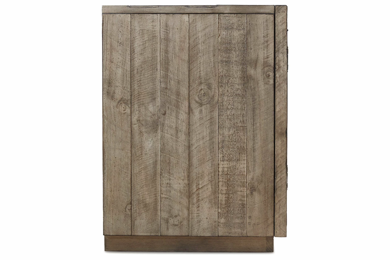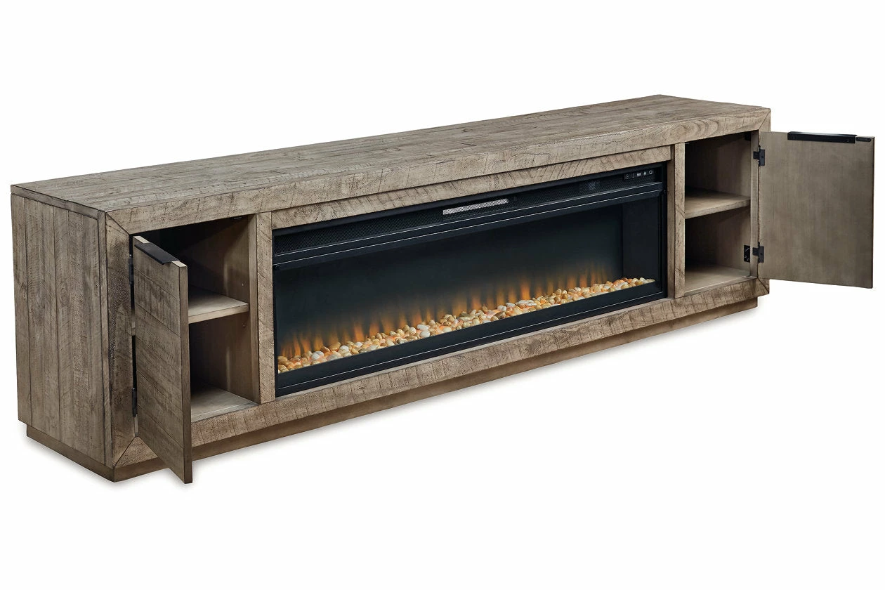 This extra-large TV stand with fireplace insert is sure to win your heart with its daring take on modern rustic expression. Its crisp, clean minimalist-chic profile is enriched with striking pine wood grain and a weathered gray finish with distressed saw mark texture. For your added viewing pleasure, the wide fireplace insert puts on a show via remote control. With the touch of a button, adjust the temperature, the color of the flame effect, or set the 12-hour timer for long-lasting enjoyment. The realistic flame effect includes color change option and faux glass crystals and natural rock inserts. Faux crystals enhance the flickering flame—or mix in stones for a natural touch (all included).
