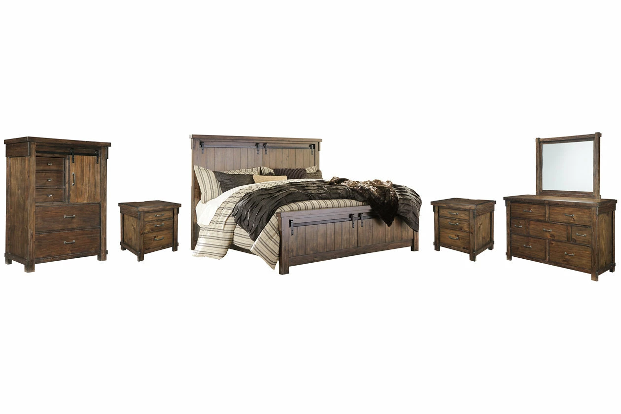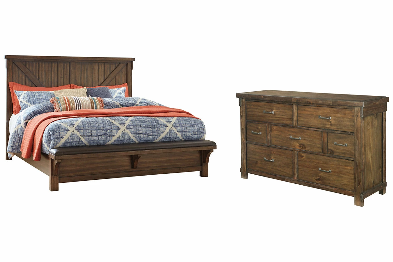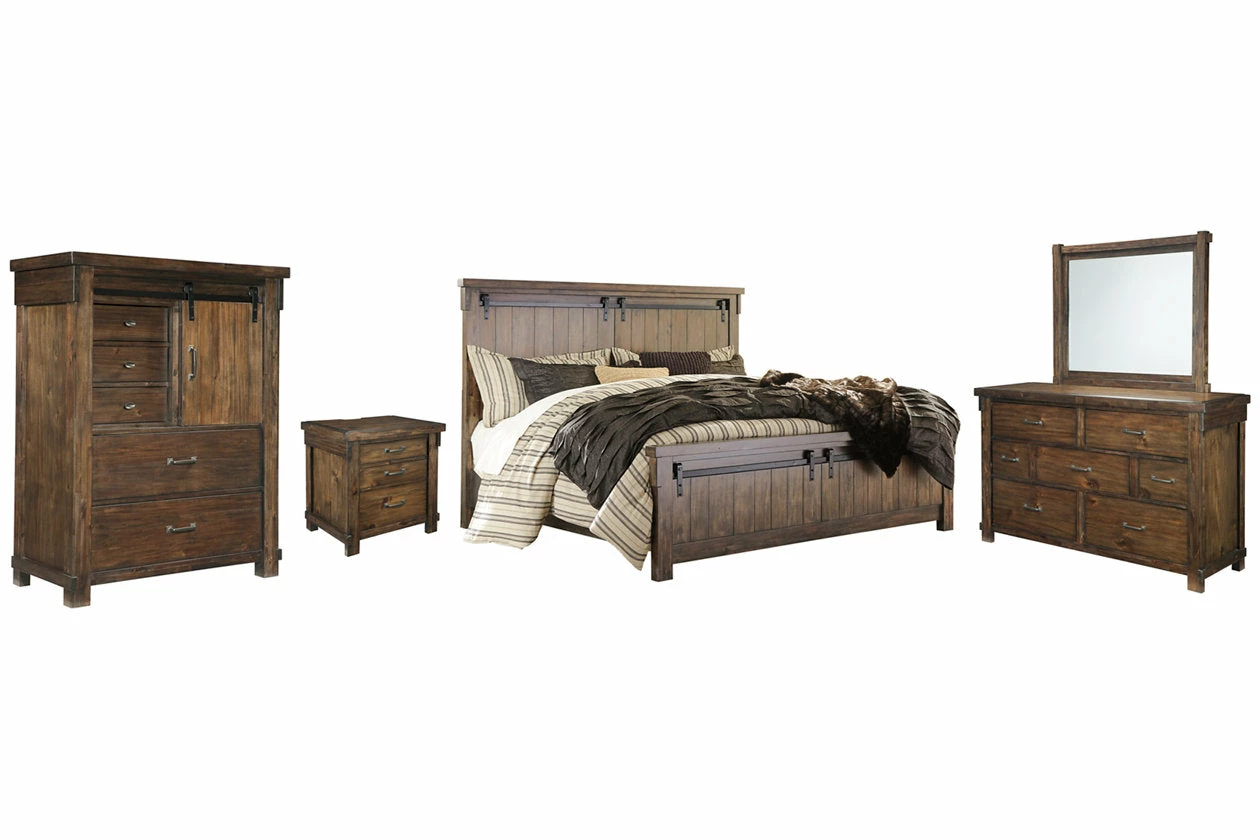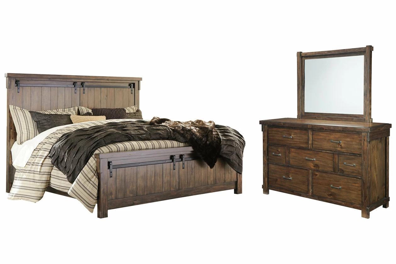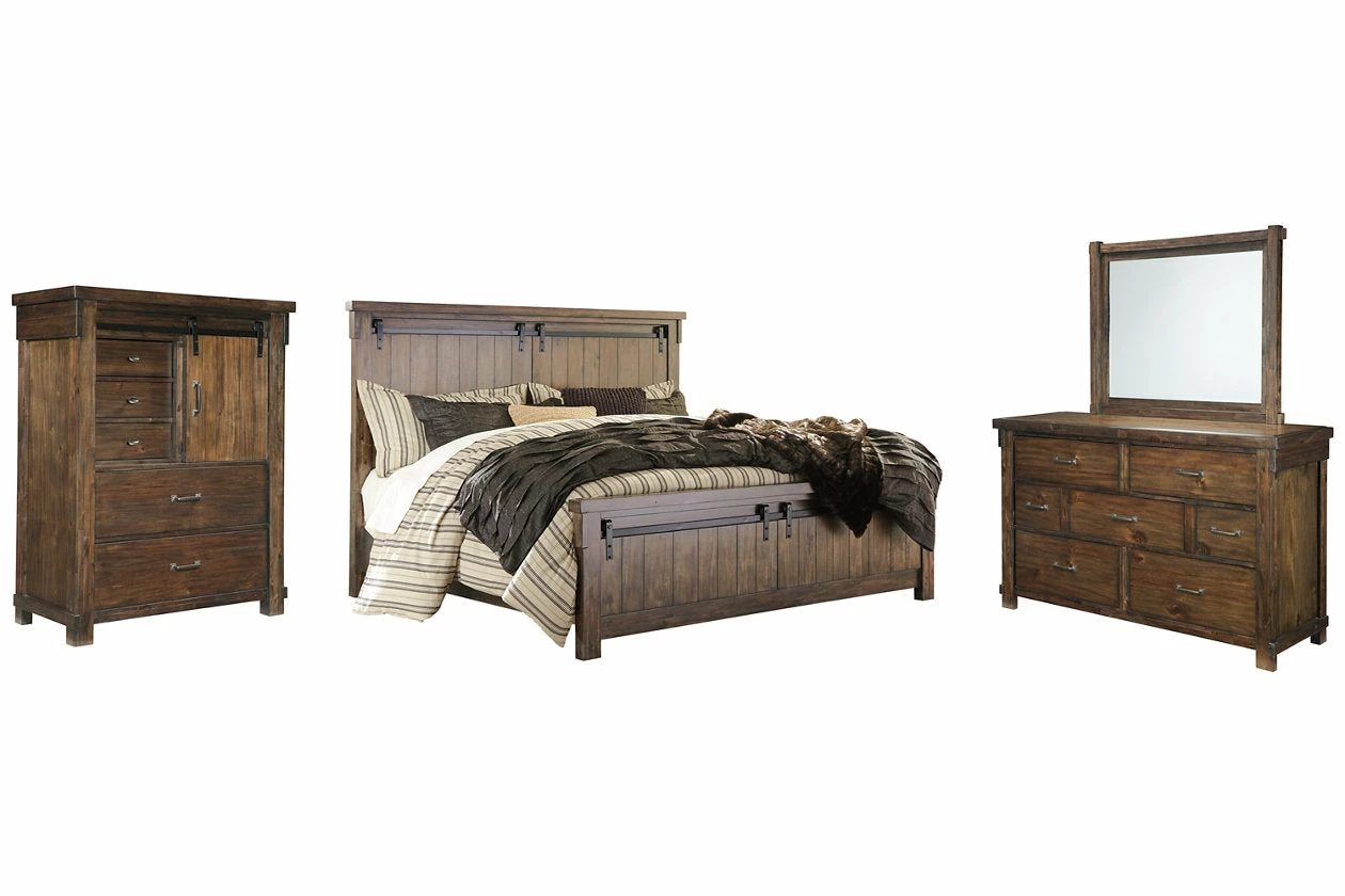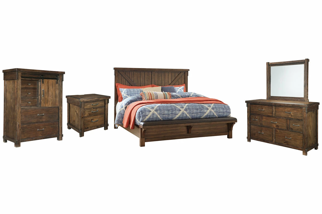 Opposites attract. This 5-piece queen panel bed and dresser set demonstrates how casual rustic styling paired with an industrial hip vibe make for one happy marriage. Elements that beautify the chunky, linear profile include through-tenon detailing, faux barn door pulls and a staggered drawer design loaded with interest. What’s even more surprising is how such high-quality designer pieces can be so attractively priced. Mattress and foundation/box spring available, sold separately.