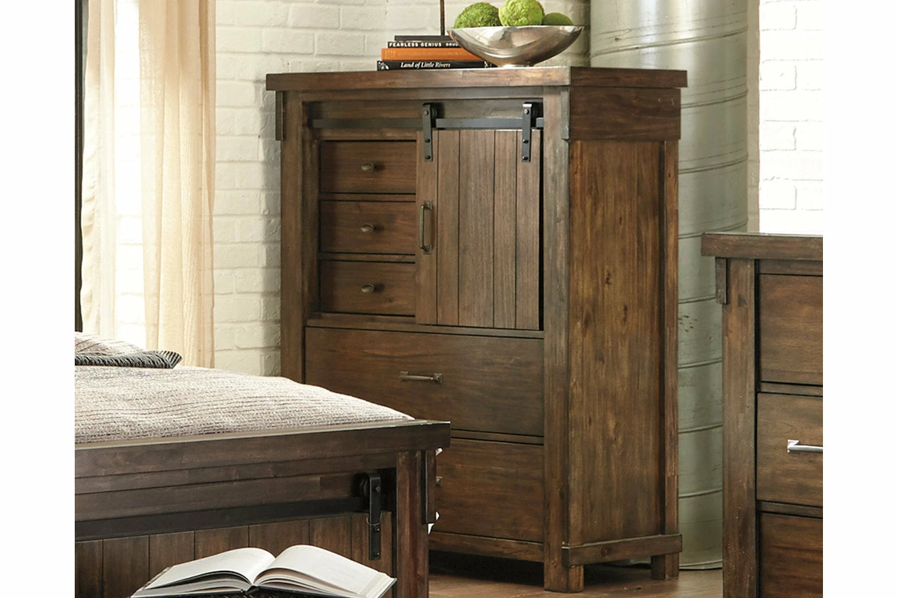 Opposites attract. This chest opens our eyes to how casually rustic styling and an industrial hip vibe make for one happy marriage. Elements that beautify the chunky, linear profile include through-tenon styling, replicated planking and a high-grain finish rich with tonal variation. Unique “barn door” slider and shelved storage are a welcome surprise. What’s even more unexpected: how such a high-quality designer piece can be so attractively priced.