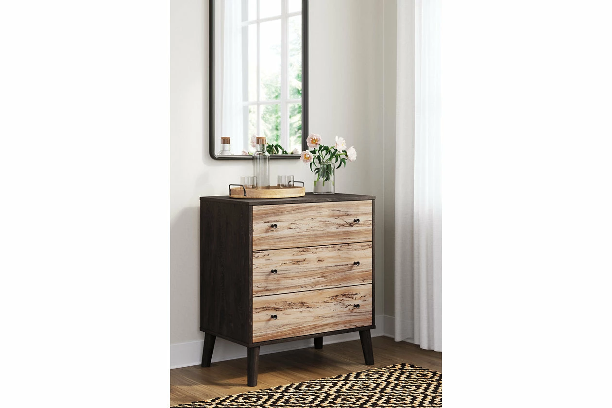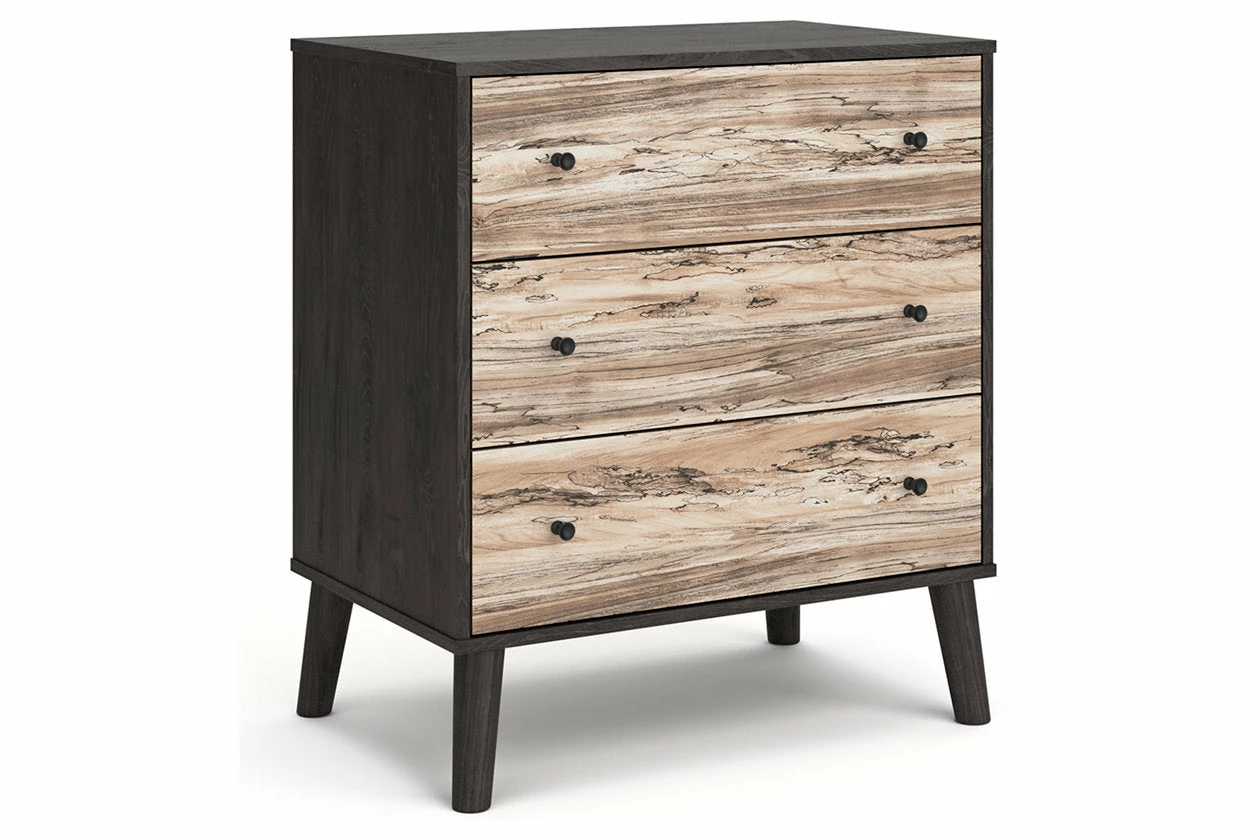 The perfect marriage of simple and contemporary style, this chest of drawers is a charming addition to your home. Effortless in its beauty, it sports an expressive two-tone look with a dark charcoal finish and replicated sugarberry wood grain. Ball-bearing glides offer smooth opening and closing of the drawers, while matte black knobs add a finishing touch.