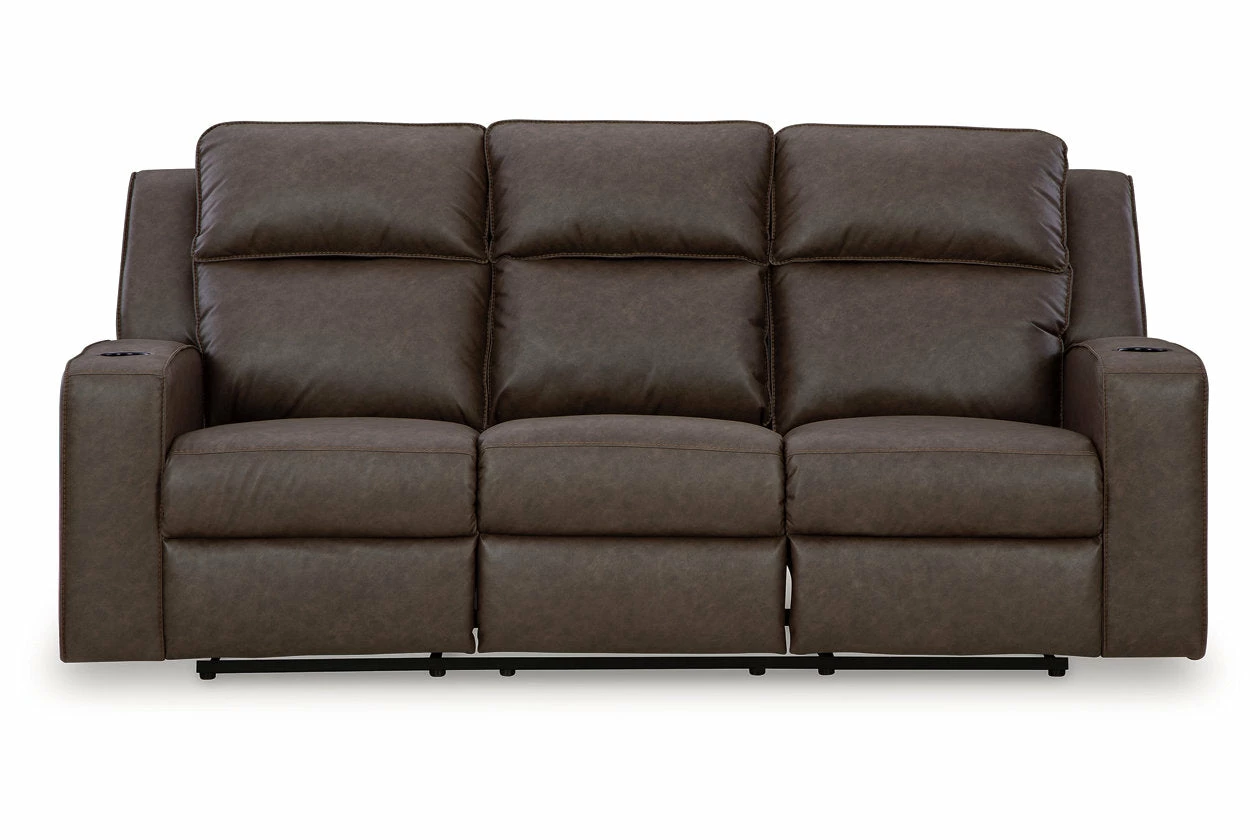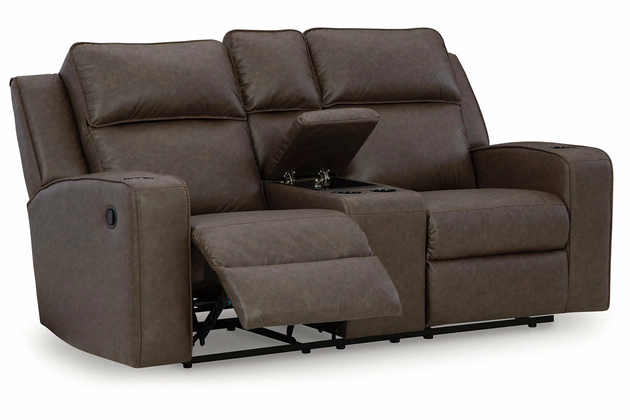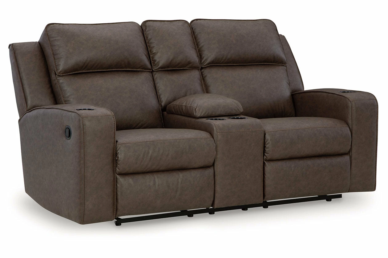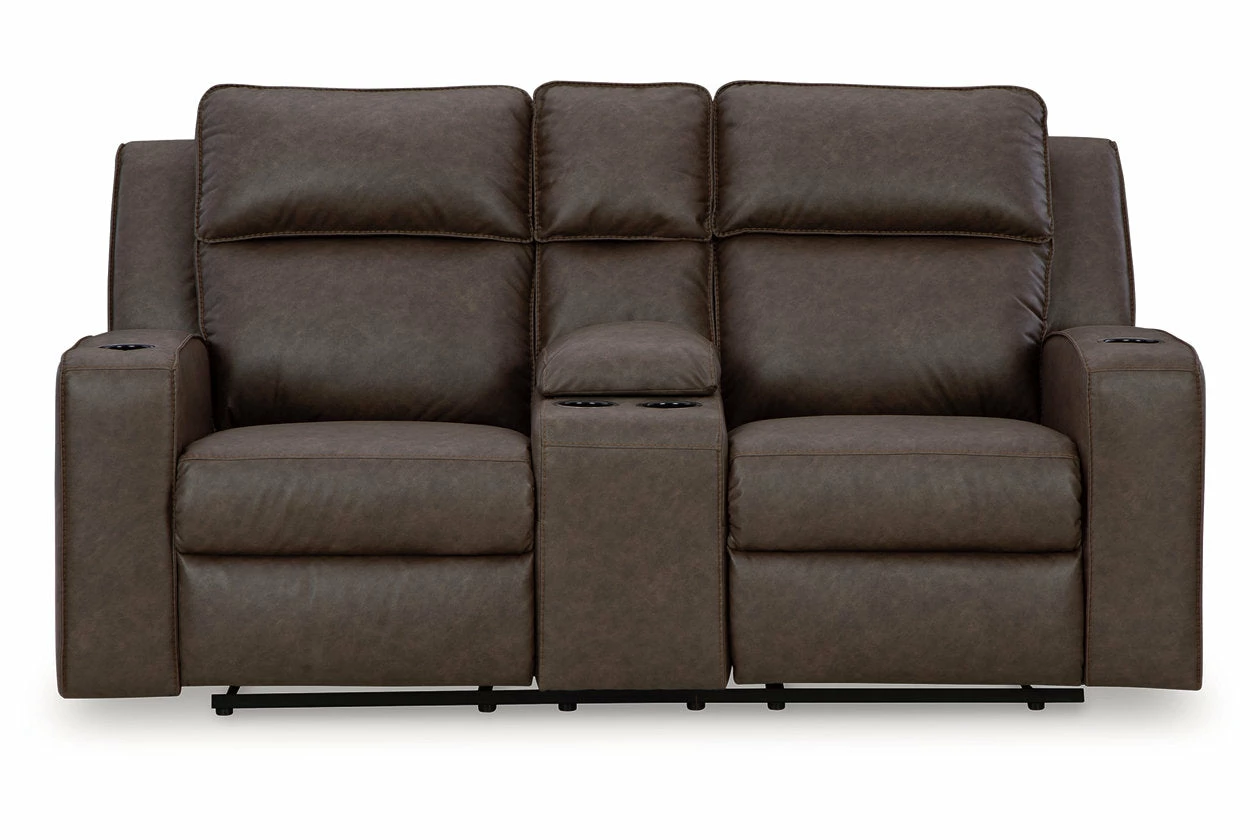 Indulge your lust for comfort and love for contemporary design with this reclining loveseat. Made for easy everyday living, it’s upholstered in a heavyweight padded faux leather and accented with contrast jumbo stitching for fashion-forward flair. Sleek track arms elevate the look with a touch of modern sensibility. A padded center console with dual cup holders completes the experience.