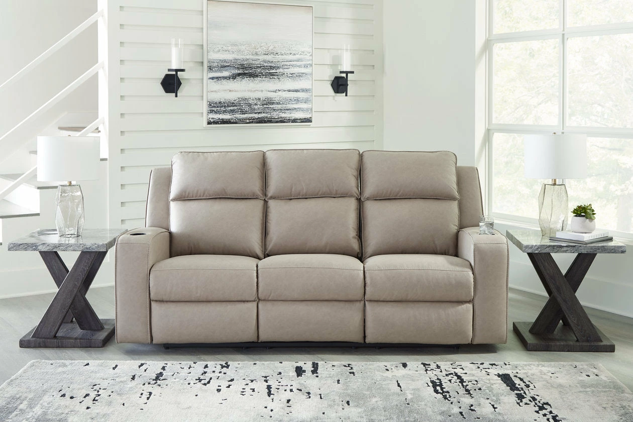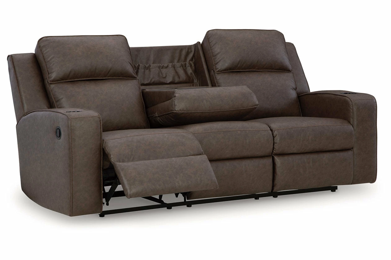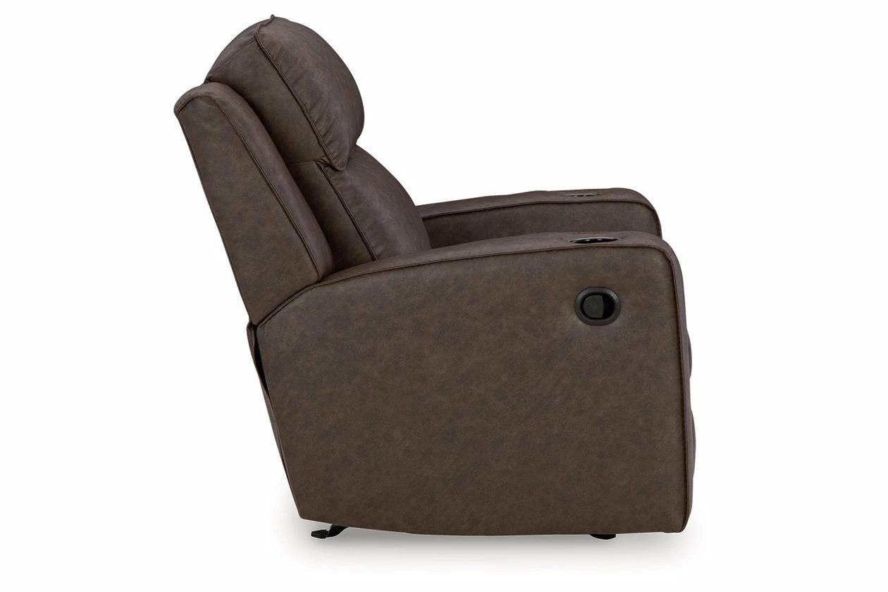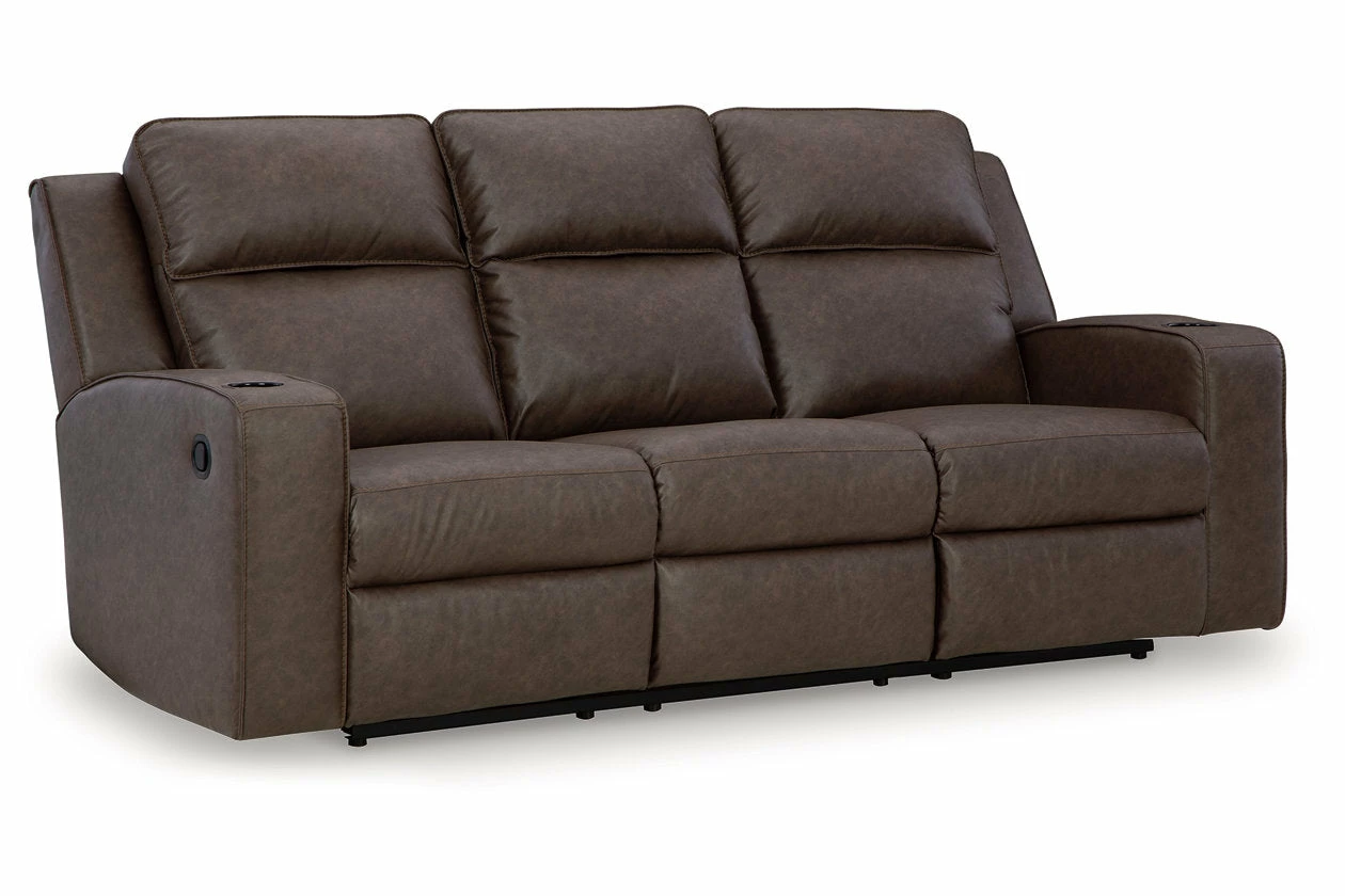 Indulge your lust for comfort and love for contemporary design with this reclining loveseat. Made for easy everyday living, it’s upholstered in a heavyweight padded faux leather and accented with contrast jumbo stitching for fashion-forward flair. Sleek track arms elevate the look with a touch of modern sensibility. A padded center console with dual cup holders completes the experience.