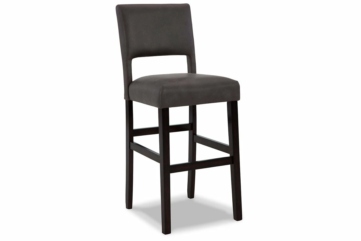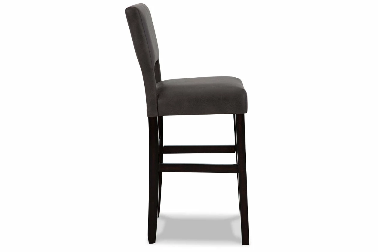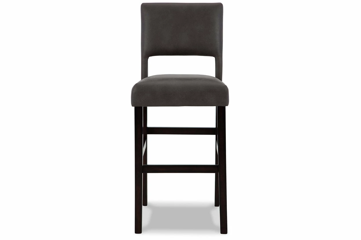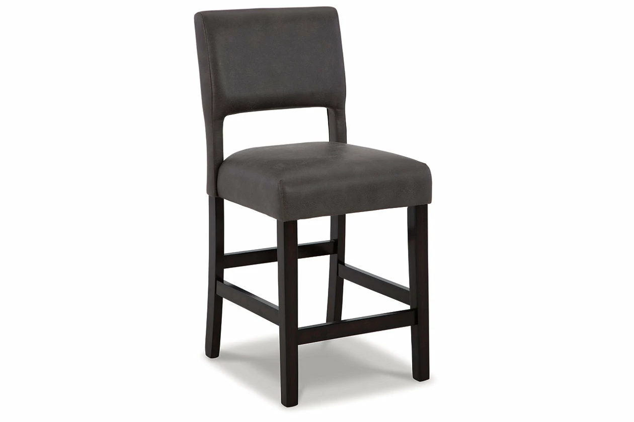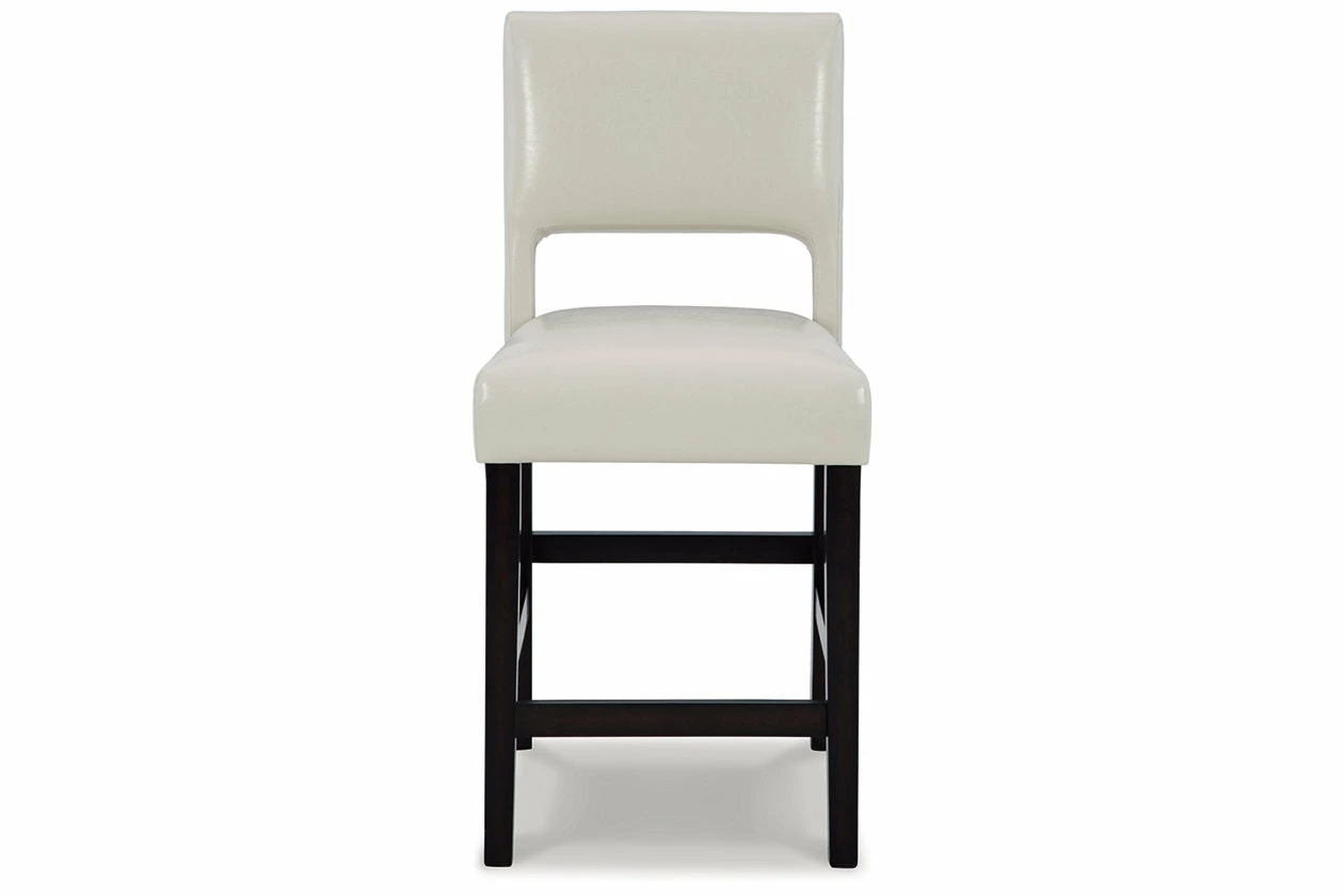 Contemporary design pairs with comfort in this upholstered bar stool. Its dark brown wood-tone frame and cut-out back provide a cool complement to neutral-toned faux leather upholstery. The counter height stool’s cushioned seat ensures that long, lingering meals are enjoyed in comfort.