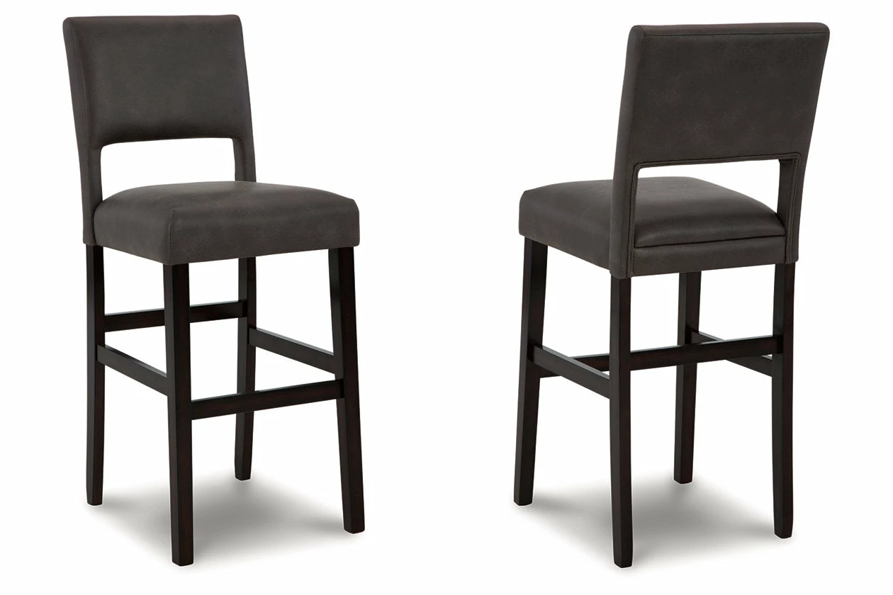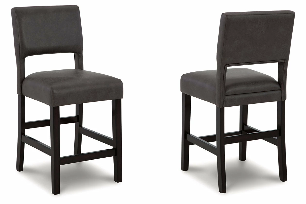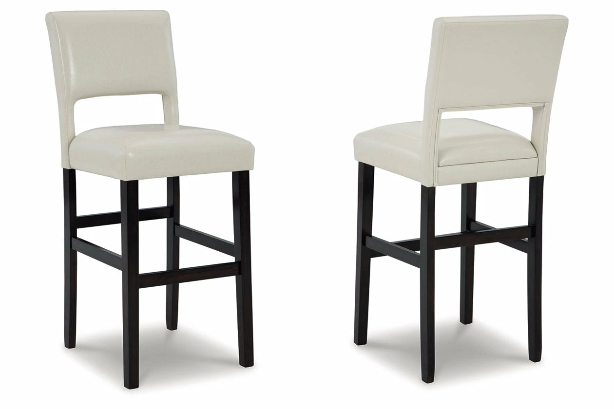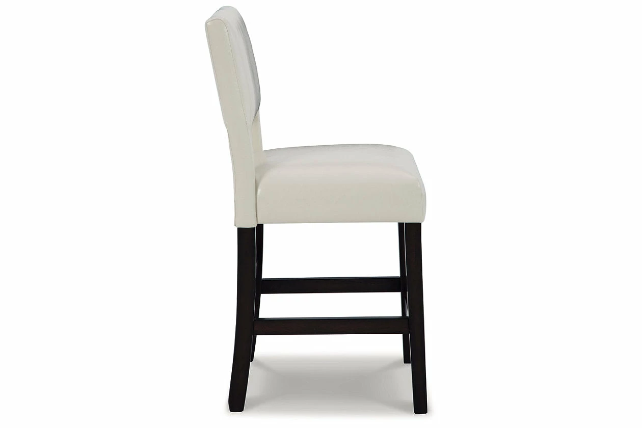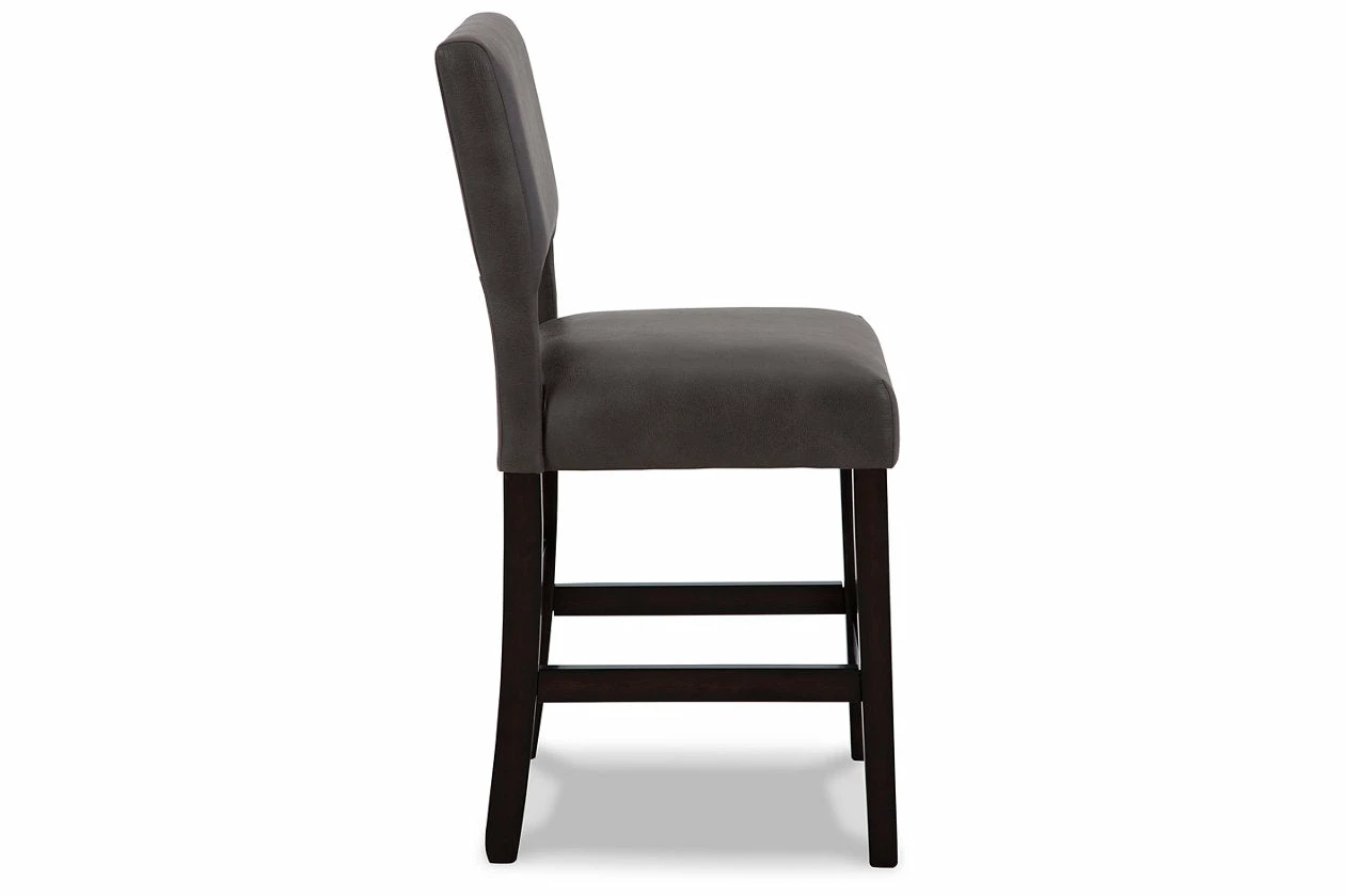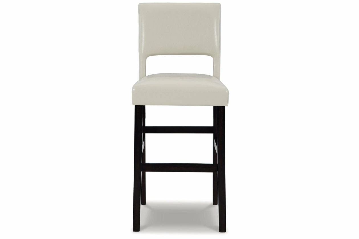 Contemporary design pairs with comfort in this upholstered bar stool. Its dark brown wood-tone frame and cut-out back provide a cool complement to neutral-toned faux leather upholstery. The counter height stool’s cushioned seat ensures that long, lingering meals are enjoyed in comfort.