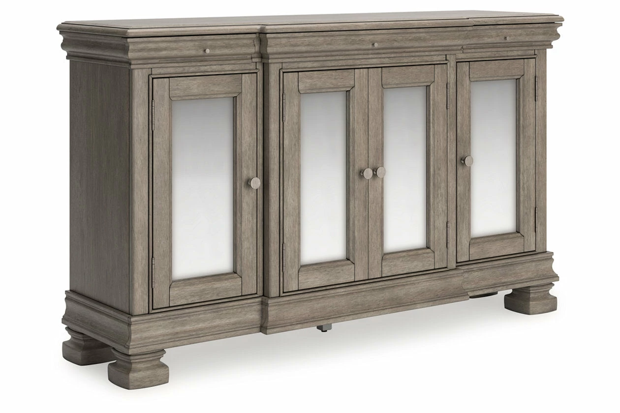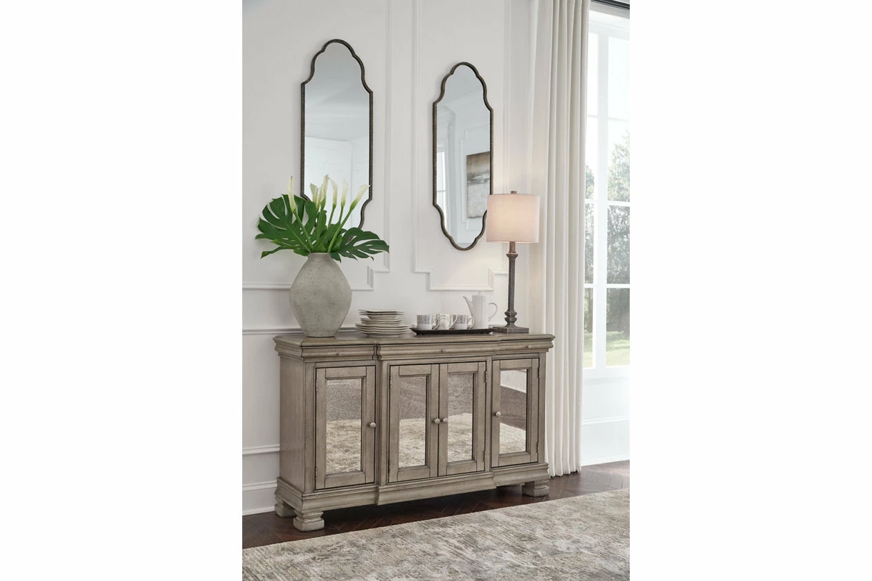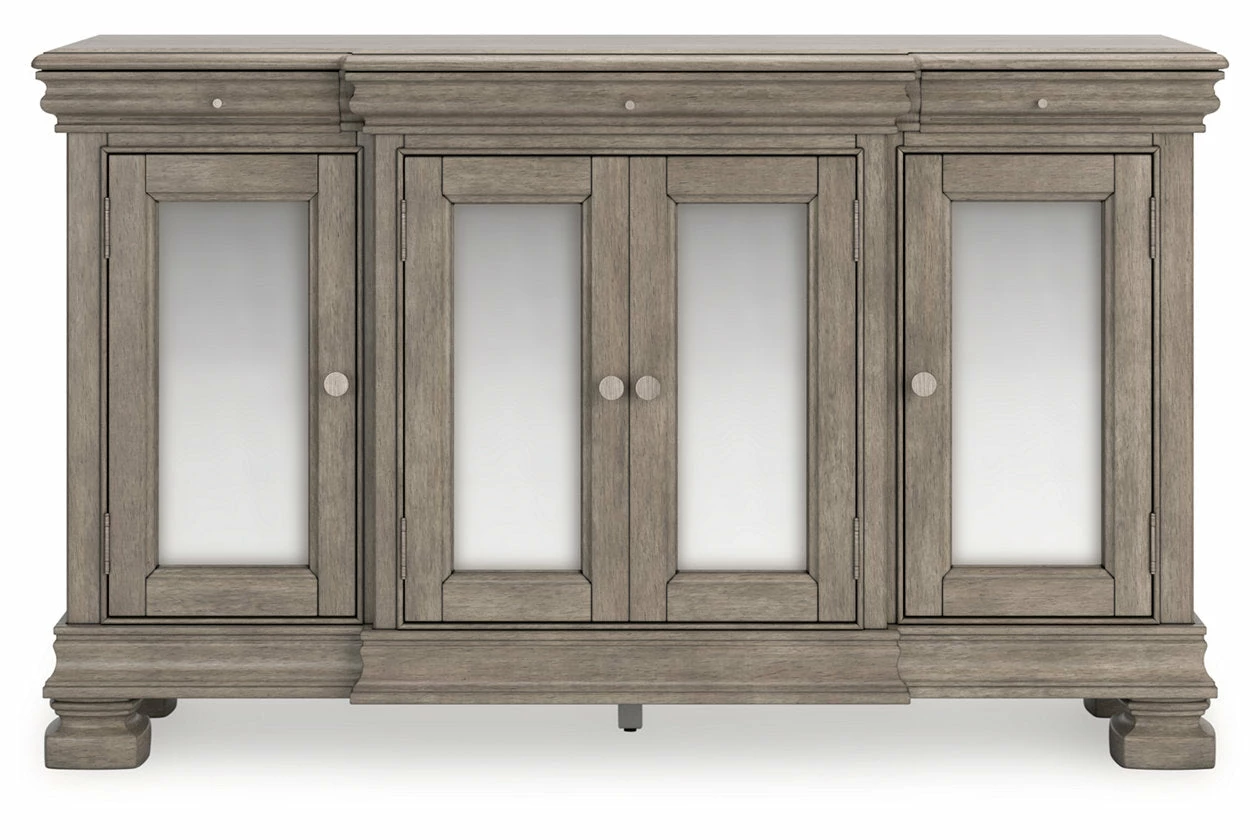 Traditional design motifs, redefined for today’s trends. Inspired by timeless Louis Philippe styling, this dining server is distinguished by its stunning attention to detail. You’ll find the light gray finish encourages an attitude of laid-back luxury. Complete with antiqued mirror doors and subtle storage drawers, it reigns over your dining room with an air of casual elegance.