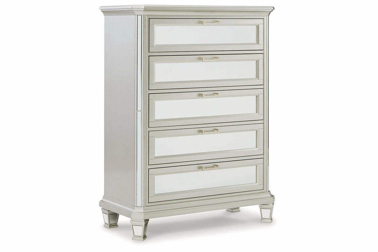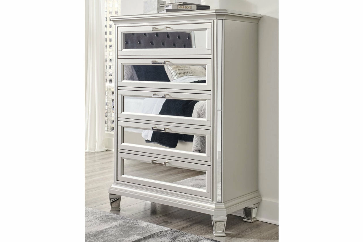 Seamlessly complete your bedroom with this striking Lindenfield chest of drawers. Its metallic silvertone finish is bold on its own, while inset beveled mirror accents take this dynamic piece to the next level. Five smooth-gliding drawers allow for the perfect balance of function and forward-thinking design.