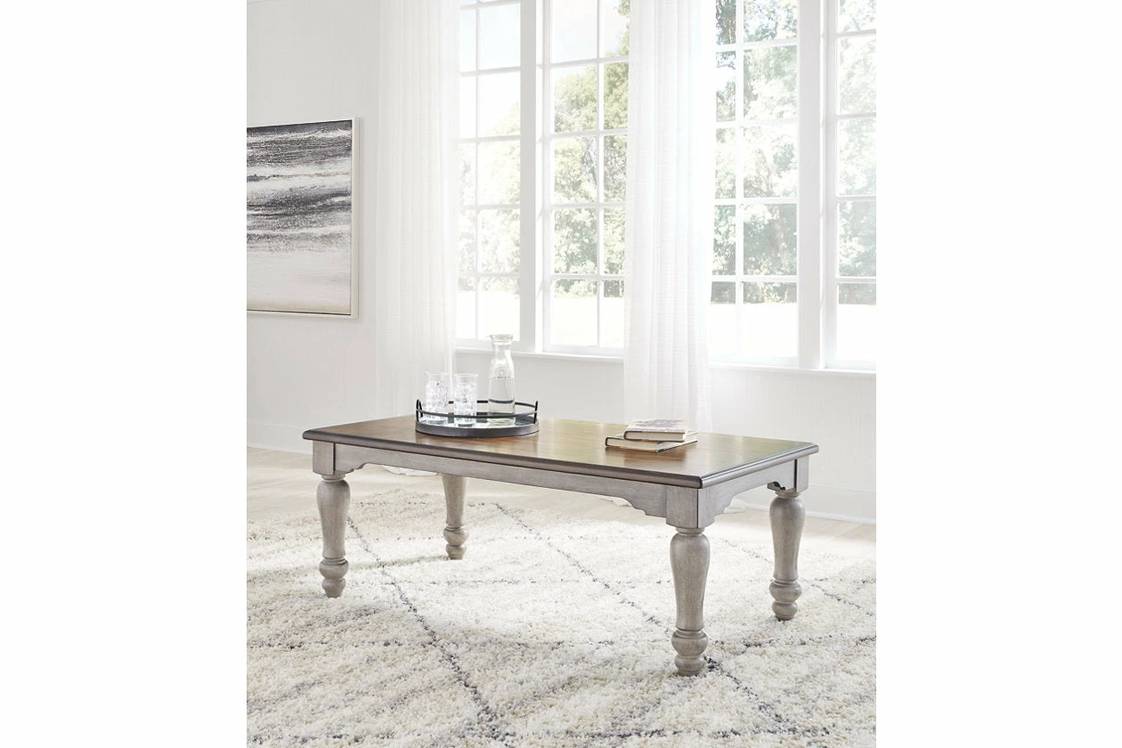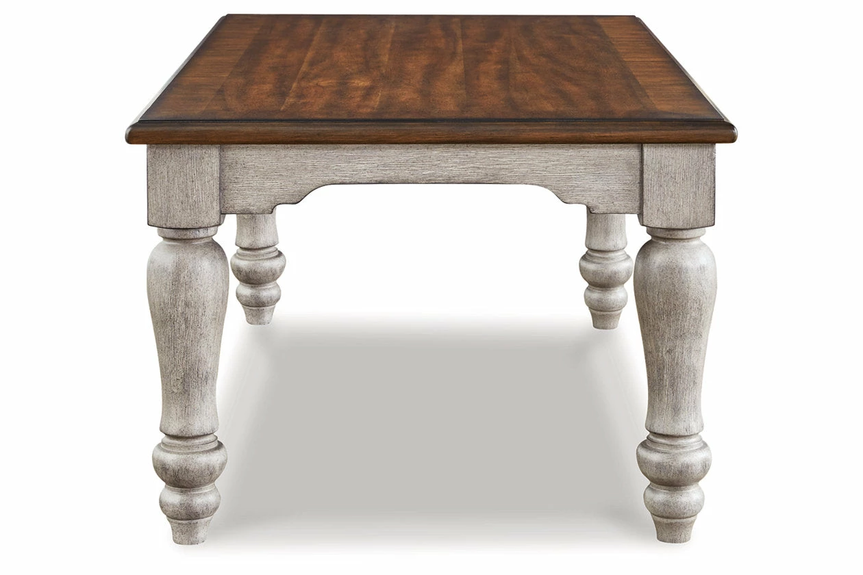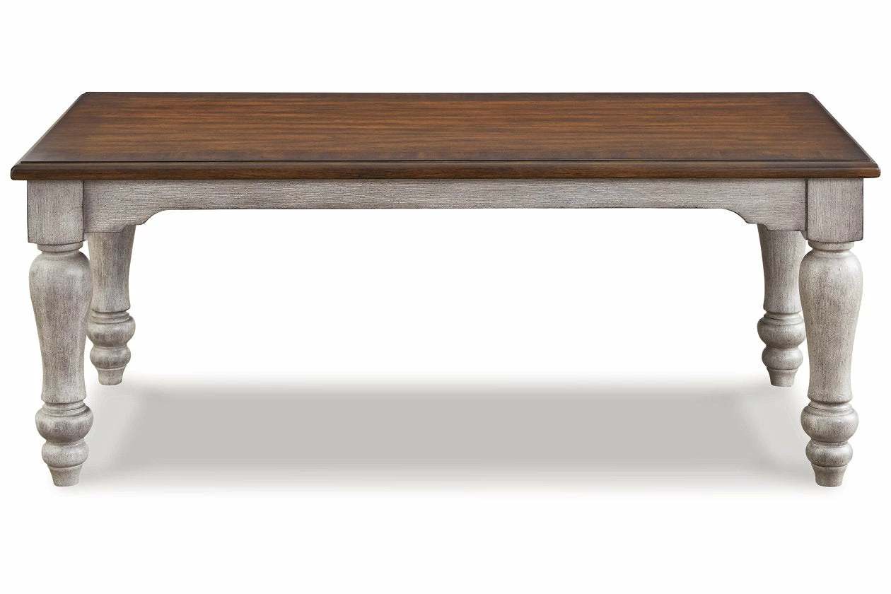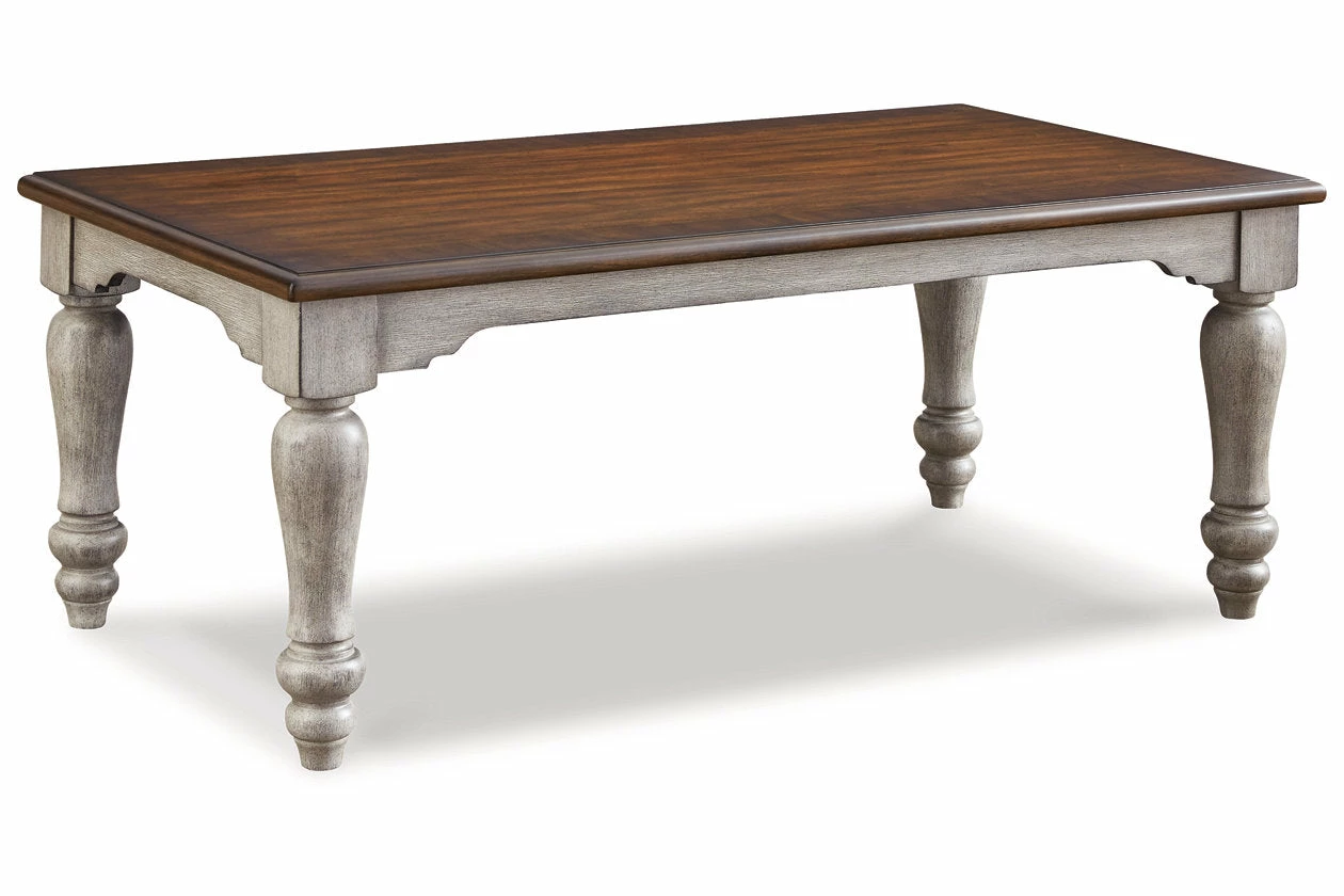 This coffee table offers understated beauty with its traditional cottage design. The outstanding two-tone finish features an antiqued gray body with a rich deep walnut brown top. Artfully turned legs add a touch of character, further enhancing the table’s simple sophistication.