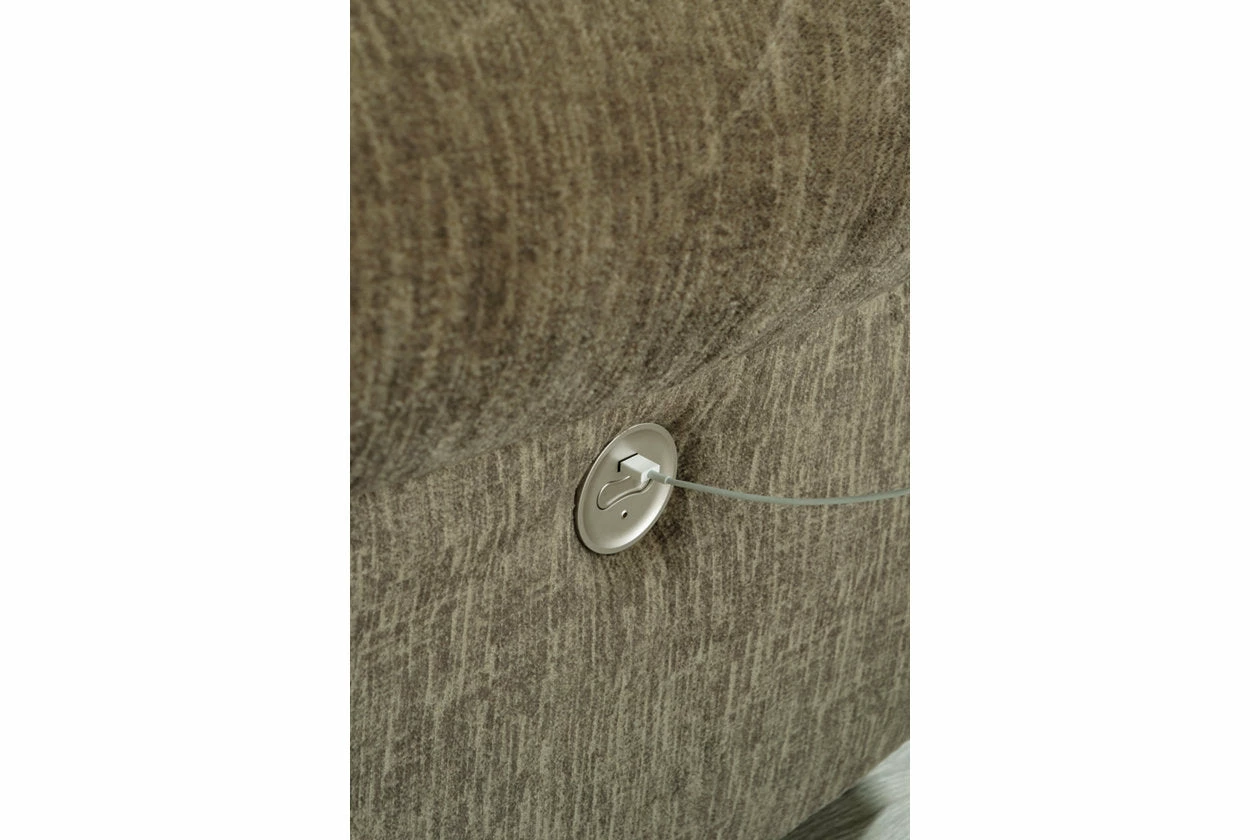 Dressed to impress. Made to caress. With this sectional with power, you get the best of both worlds: the cool look of leather and the warm, cozy feel of fabric. Sporting a transitional look that suits contemporary and classic interiors, the high-style sectional is wrapped in a taupe faux leather and enriched with divided back cushioning, jumbo stitching and roll armrests for fashionable flair.