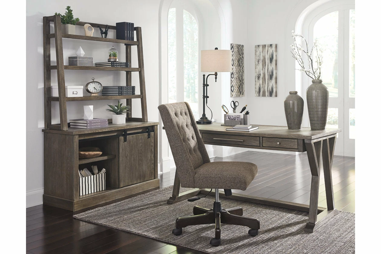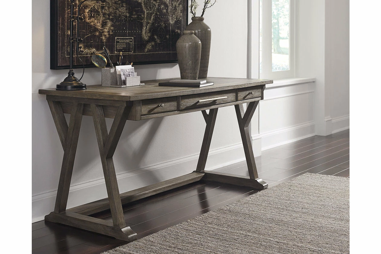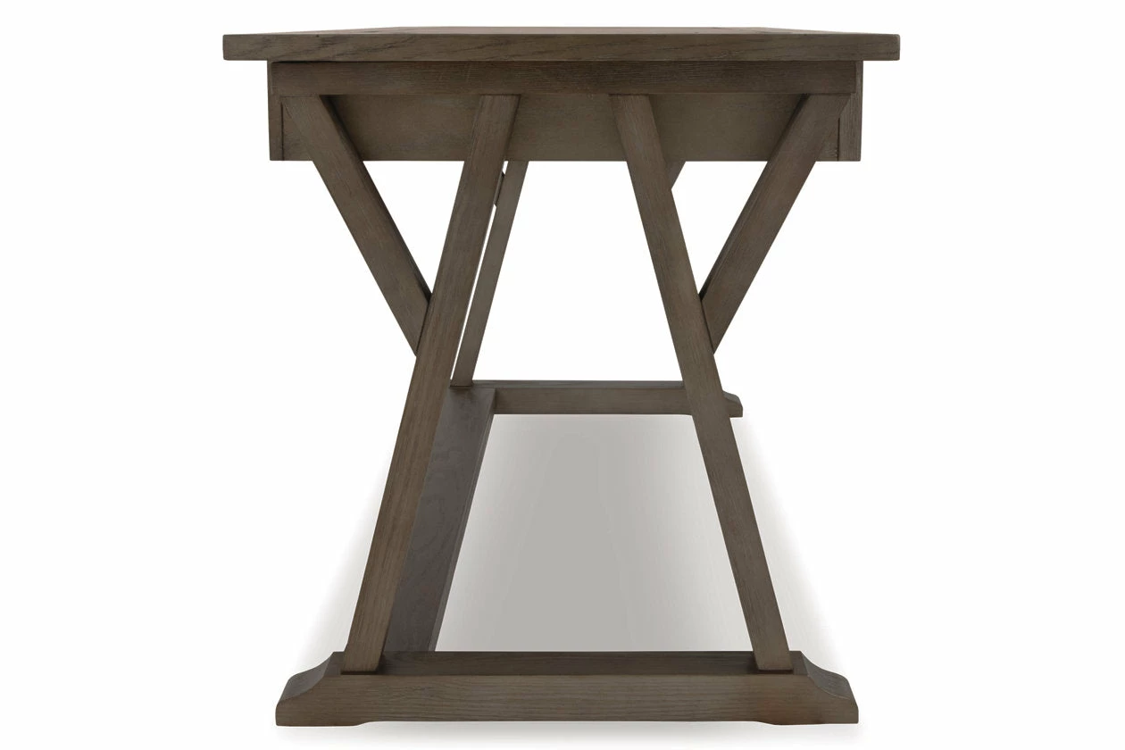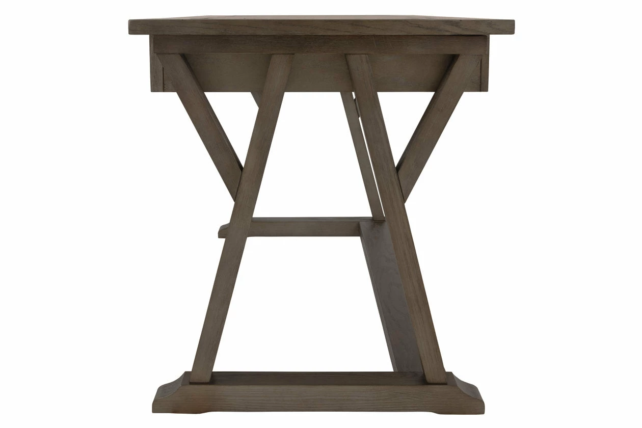 Work the latest trend in casual farmhouse living with this home office desk. Elements include distinctive cross brace with stretcher styling and a wire brushed gray-brown finish that’s so easy on the eyes. Making this home office desk all the more unique: a faux bluestone inset on the desk top for a mixed media twist. Three smooth-gliding drawers with brushed nickel-tone pulls help keep you organized and on task.