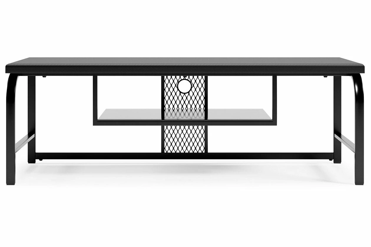 This ultra-stylish and contemporary TV stand is right in tune with your way of living. Its sturdy metal frame includes a satin dark gray metallic finish and engineered wood top. Tech-inspired decorative laminate surface with softly profiled edges and a suspended black glass media shelf perfect the aesthetic. This TV stand, which includes a mesh modesty panel for convenient cord management, makes a great gaming setup, too.