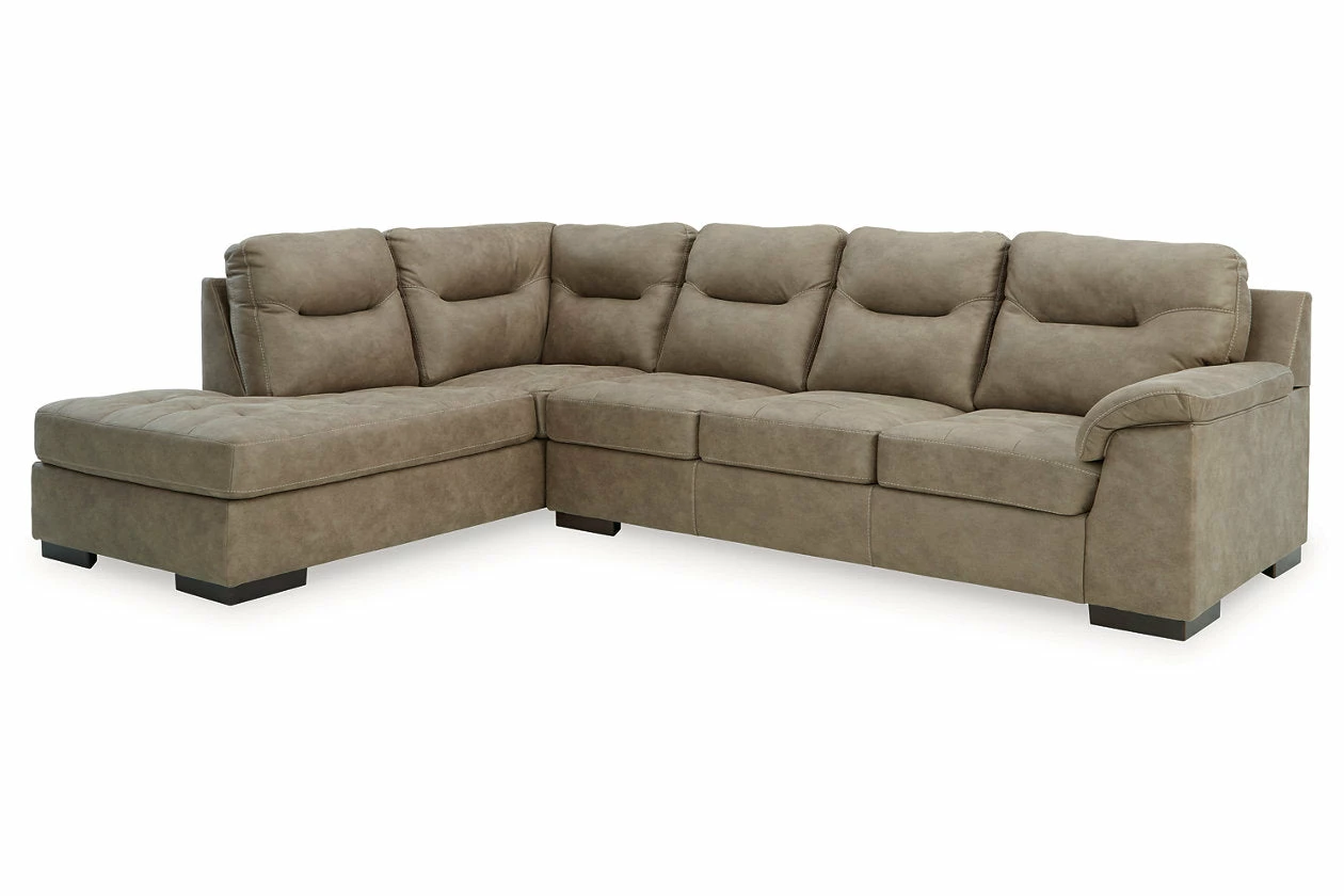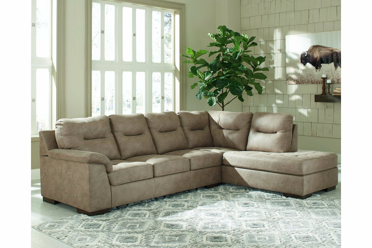 If you love the idea of a luxe look that won’t break the bank, make yourself comfortable with this alluring light-hued sectional in a neutral shade of pebble brown. Designed to look like the real thing, it’s wrapped in a practical faux leather loaded with natural tonal variation and a soft hand feel. Appealing to a contemporary taste, its jumbo stitching, tufted styling and pillow top armrests are indulgently comfortable, with a streamlined look that tops off the high-end aesthetic made for everyday living.