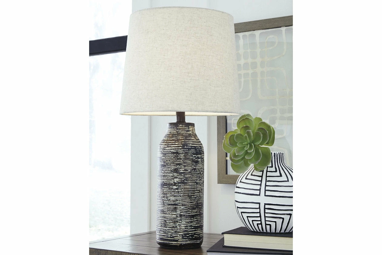 Effortless with a fashionable edge. This table lamp lights your home with urban industrial vibes. A black and white finished paper composite surrounds the base with a worn, textural aesthetic.