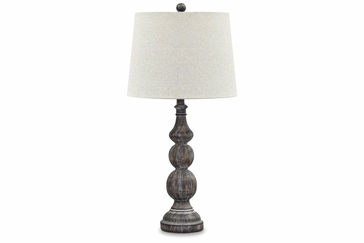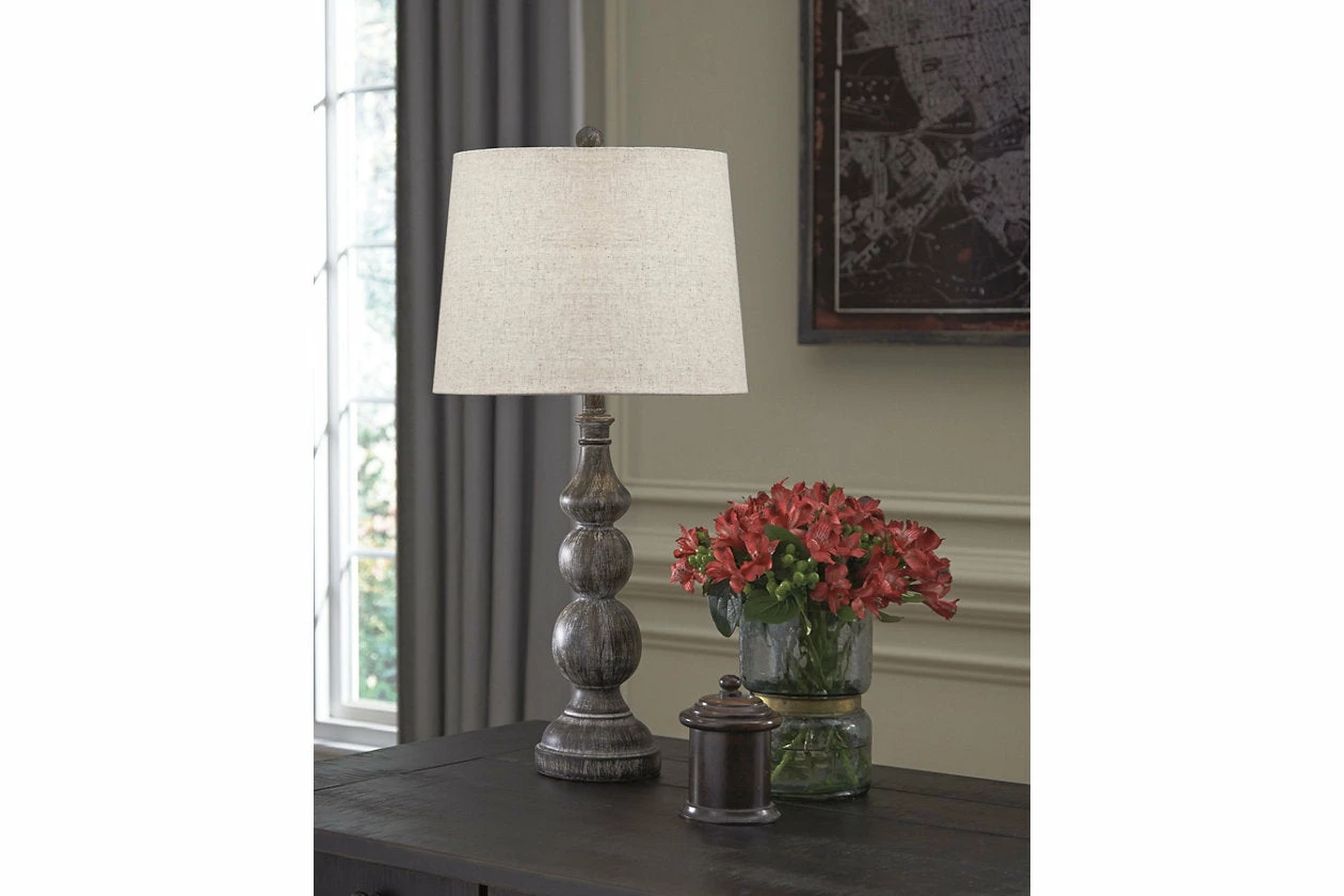 Light up your room in timeworn sophistication with this handsomely crafted table lamp. A black finish with two-tone gradations moves your eye from top to bottom. The silhouette of the lamp’s turned base contrasts beautifully against the neutral drum shade.