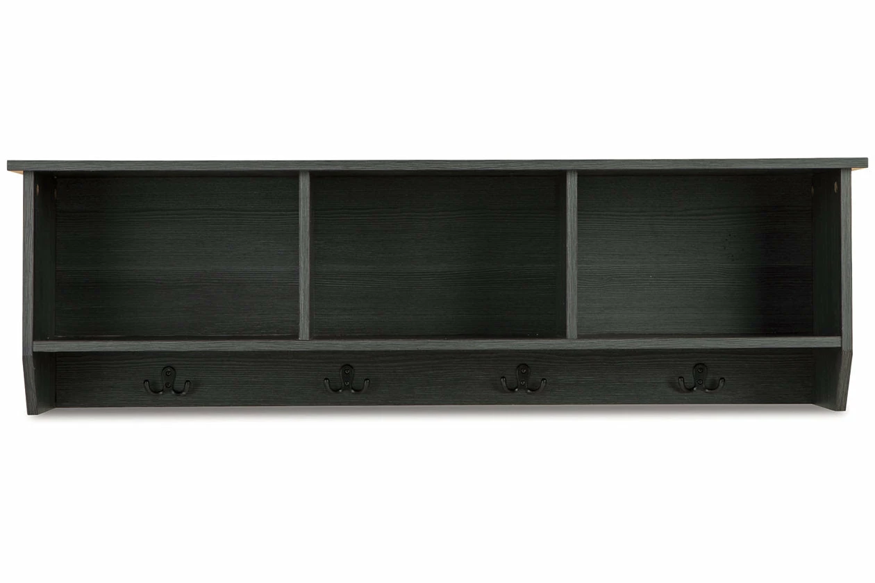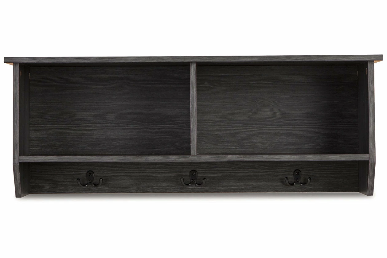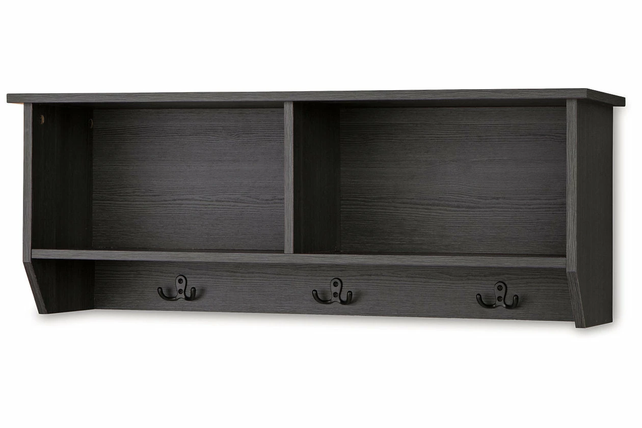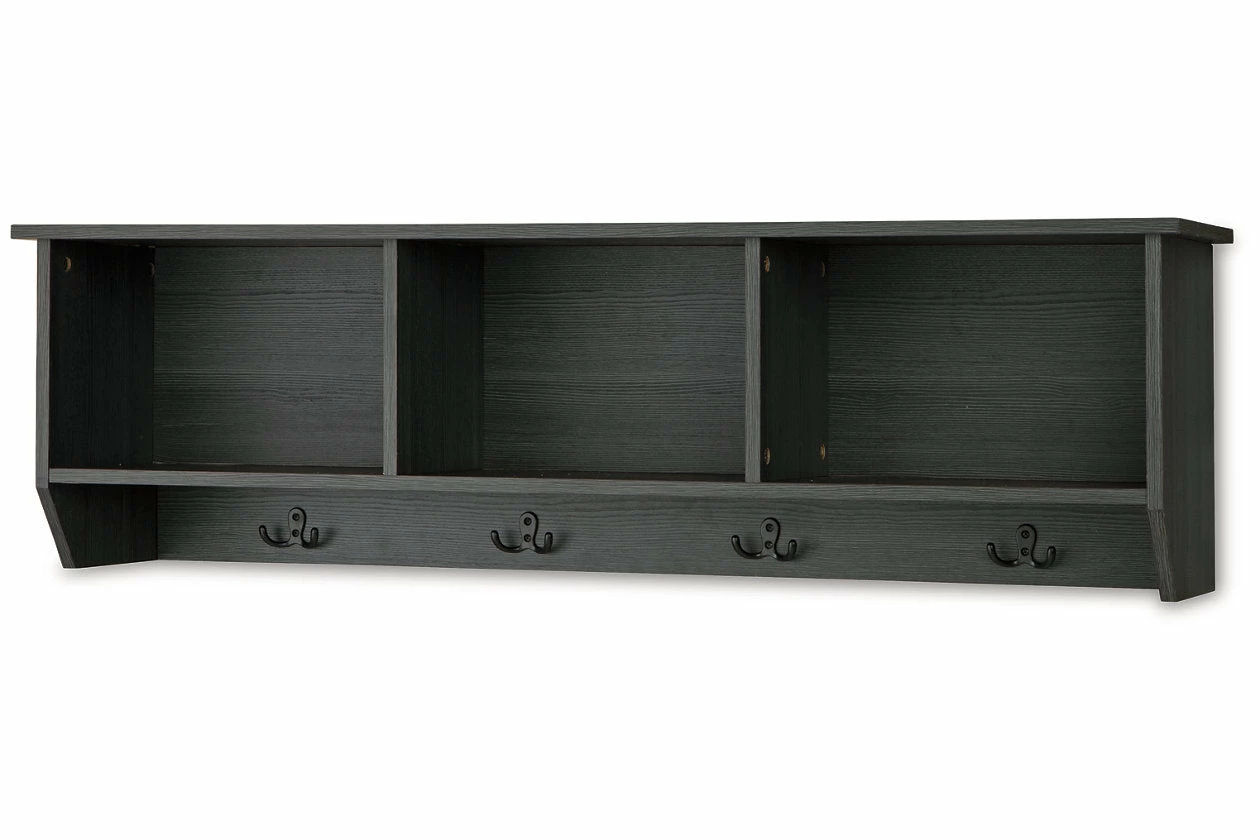 Short on organization? Look no further than this space saving wall-mount shelf. The antiqued gray finished wood brings warmth to any room, while the three hooks make storage of coats and other accessories a breeze.