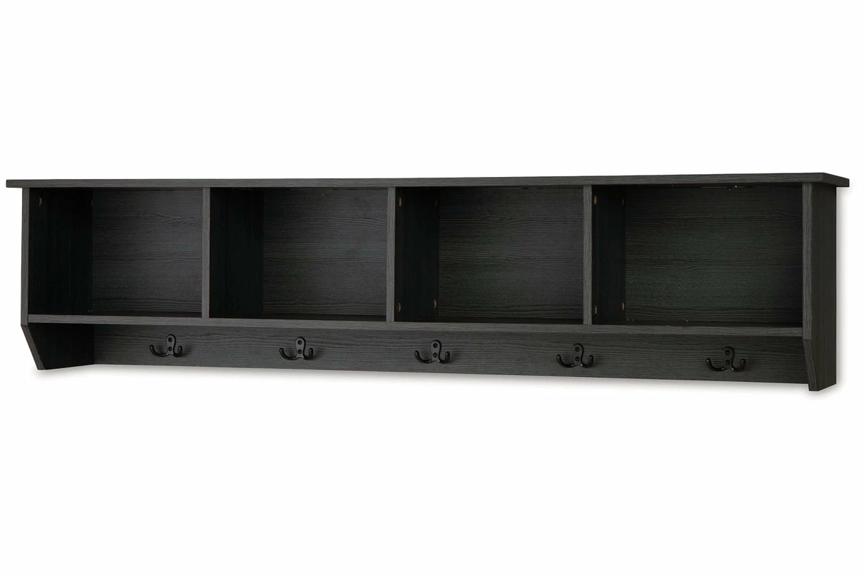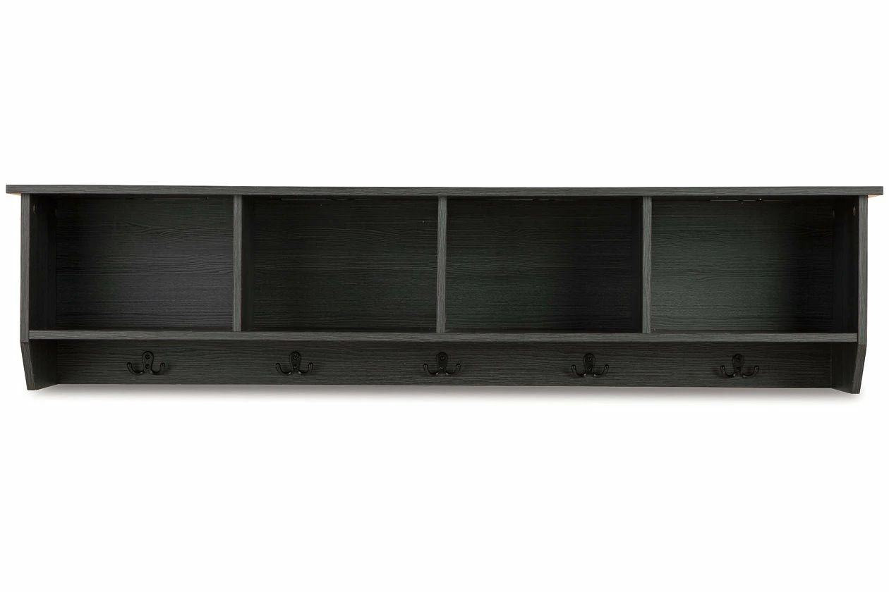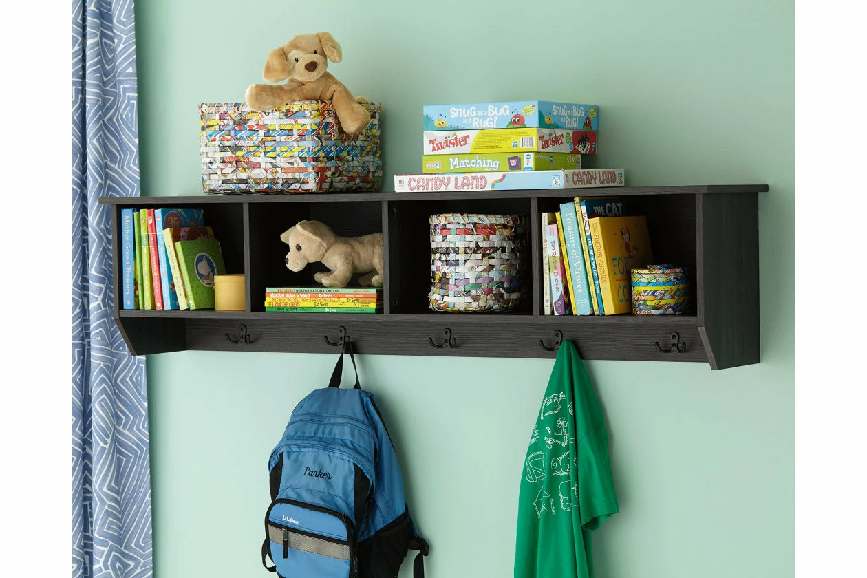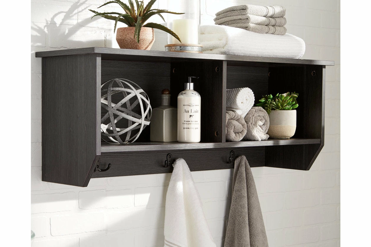 Short on organization? Look no further than this space saving wall-mount shelf. The antiqued gray finished wood brings warmth to any room, while the three hooks make storage of coats and other accessories a breeze.