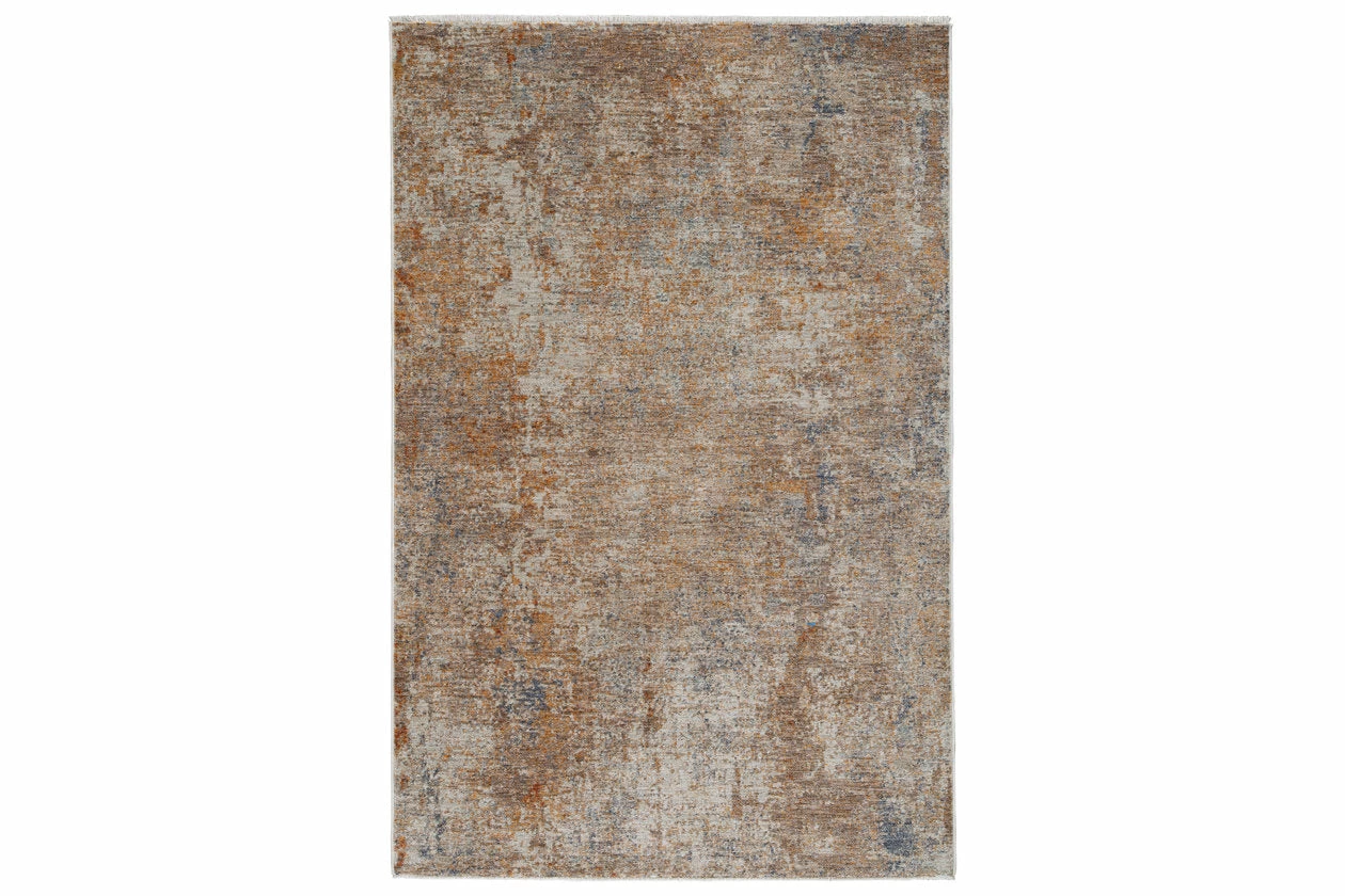 This area rug is a stellar study in color, movement and texture. Featuring a watercolor abstract effect in shades of cream, orange, brown, gray and blue, this vibrant rug makes a statement wherever it is displayed.