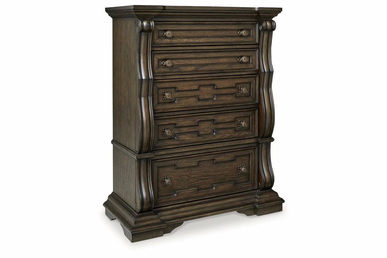 From its ornamental appliques to its large scale, this chest of drawers makes a bold statement. Spacious drawers store your clothes and more in stunning style. The look is timeless. The feel? Right at home.