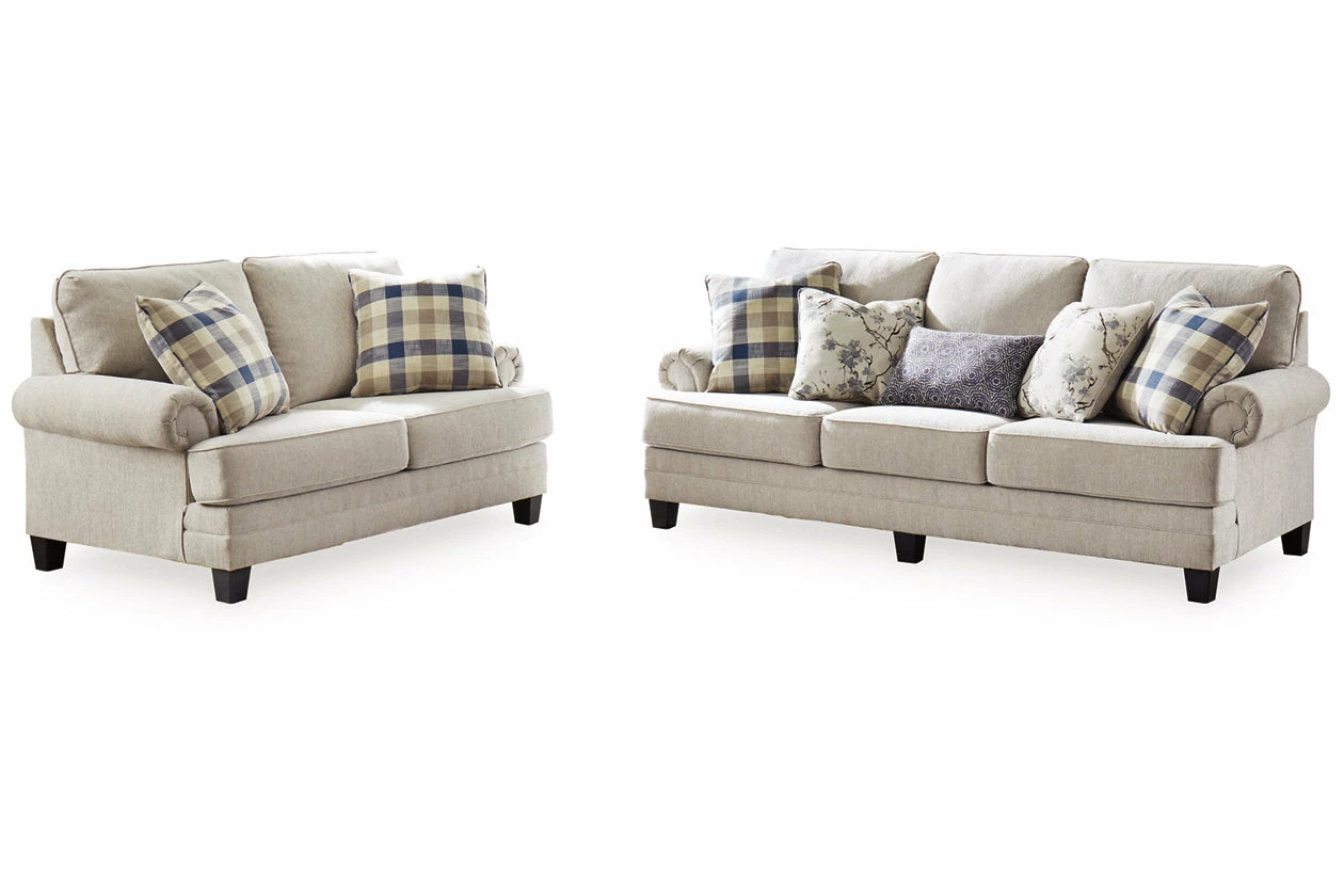 If you yearn for furniture that can transition seamlessly—whether your space is classic, coastal chic or contemporary—rest assured this sofa and loveseat set is an inspired choice. Sporting a textured weave, the chenille-feel upholstery in a light linen tone is a pleasure for the senses. The eclectic mix of plaid and floral patterned accent pillows is so unexpected—yet such a welcome surprise.