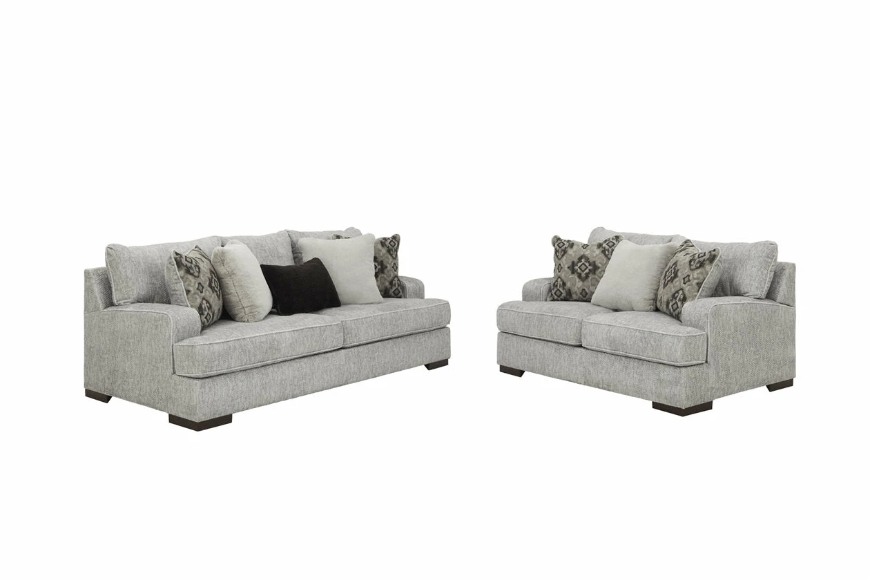This 2-piece sofa and loveseat set with deep seats crafted for ultra-plush softness is the ideal merger of modern flair and classic staying power. If you love a touch of texture, you’re sure to appreciate this set’s gorgeous gray upholstery with subtle chevron effect.