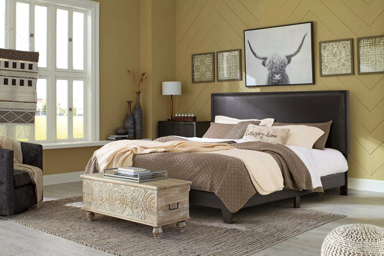 Add a luxe feel to your casual aesthetic with this king upholstered bed. Foam-cushioned panels are upholstered in a rich dark brown faux leather for a sleek, expensive vibe without the high price tag. Best of all, the low-profile slat foundation eliminates the need to purchase an additional box spring.
