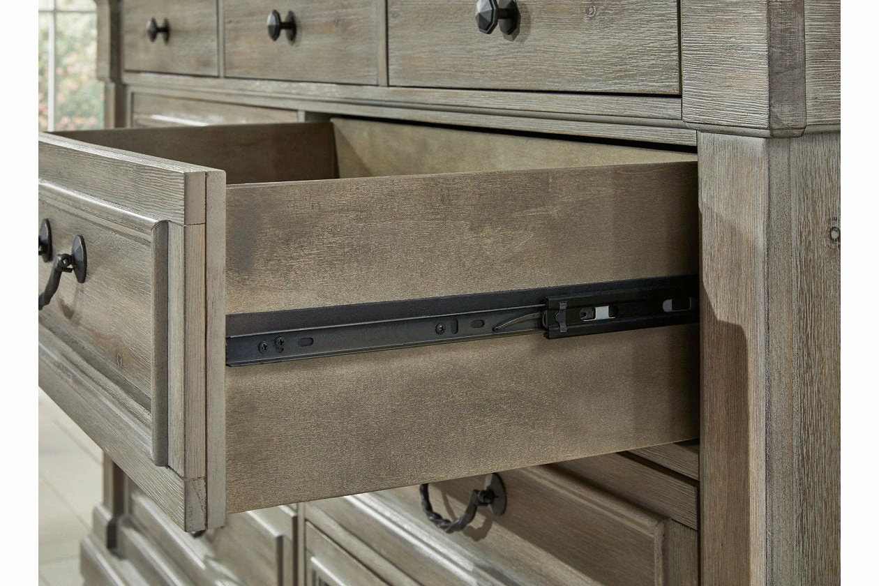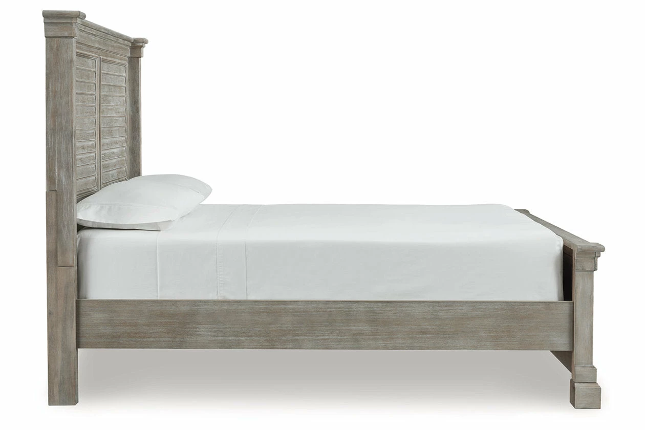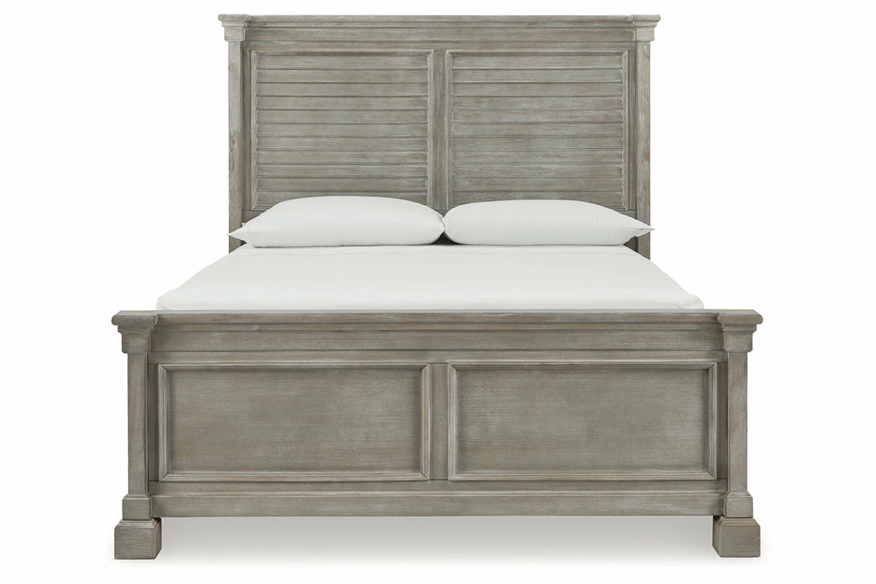 Put a simple twist on your approachable sense of style with this classically charming king panel bed. A glazed bisque finish covers the wire-brushed textural surface, with natural wood undertones bringing additional dimension. Louvered accents embellish the headboard, infusing this chic piece with an air of traditional elegance.