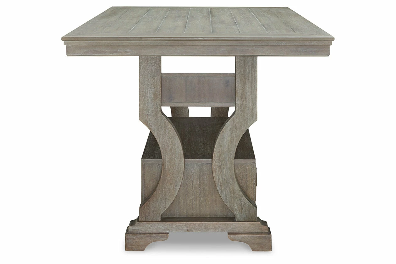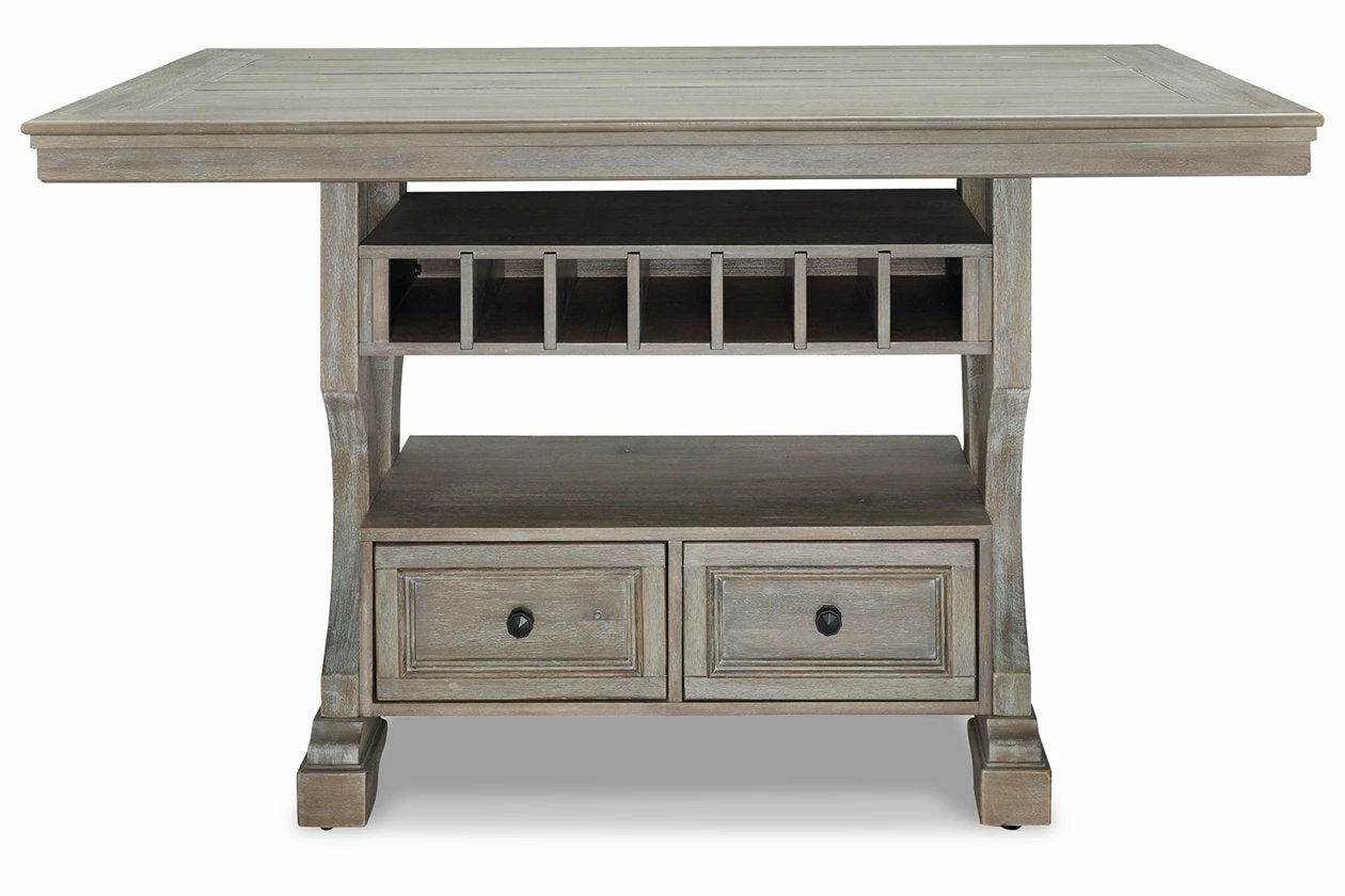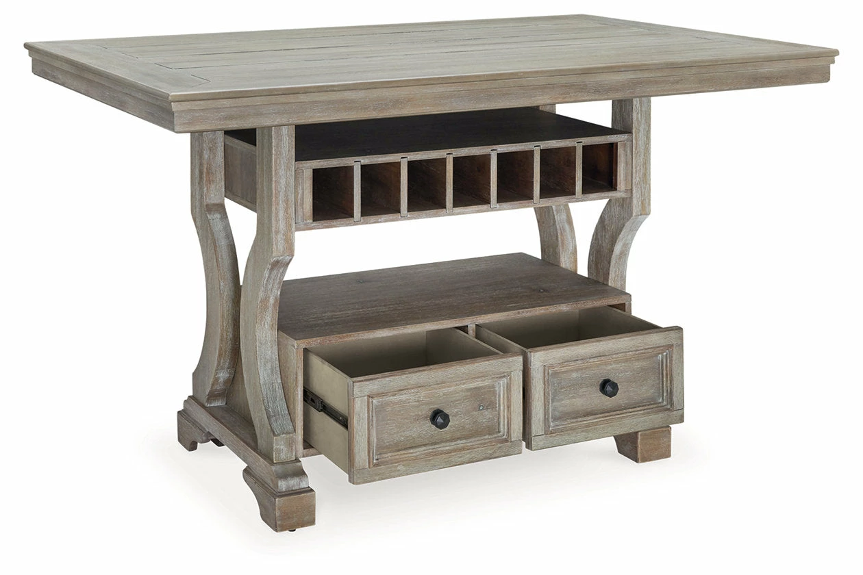 Put a simple twist on your approachable sense of style with this classically charming counter height dining table. A glazed bisque finish covers the wire-brushed textural surface, with natural wood undertones bringing additional dimension. Storage drawers, a shelf and wine cubbies decorate the base, infusing this chic piece with elegant functionality.