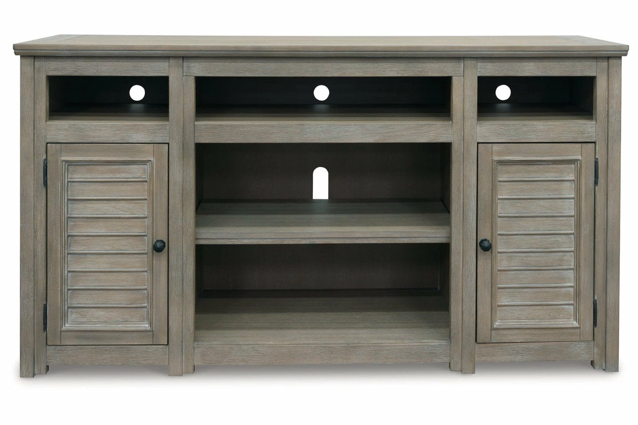 Lighten the look of your living space. This 72″ TV stand offers a casual traditional aesthetic, with natural wood undertones enhanced by a glazed bisque finish and wire-brushed texture. Louvered cabinet door panels with overlay mouldings add style and dimension. And there’s ample room to store accessories, with adjustable shelving and cord management holes adding convenience and versatility. An electric fireplace insert (sold separately) brings warmth and ambiance to your living room with the touch of a button.