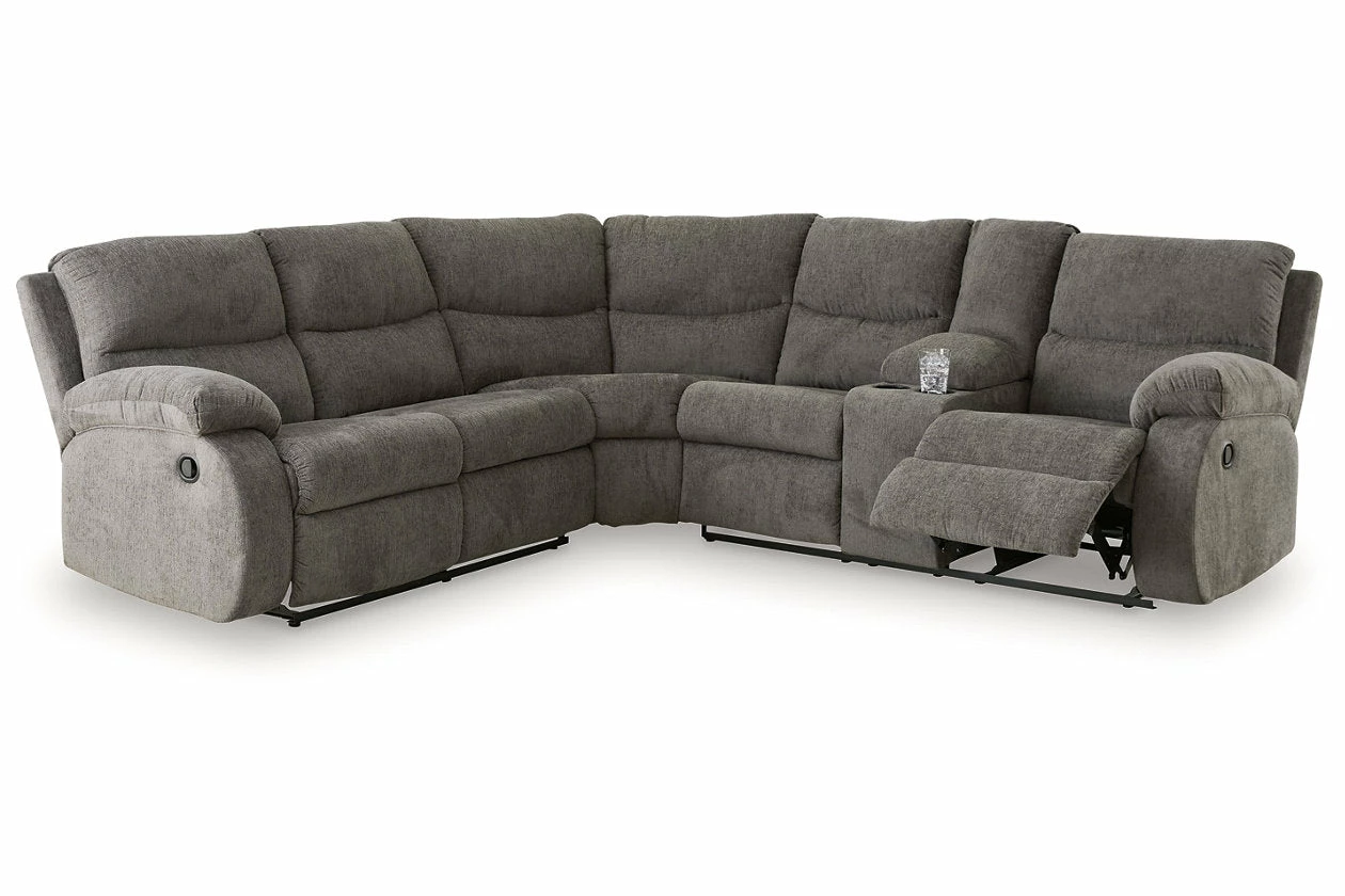 Cozy comfort is on the rise with this reclining sectional. So velvety soft, the trendy pewter-hued chenille upholstery is made for everyday indulgence. Overstuffed and stylishly wrapped, the sumptuous cushions and pillow top armrests display the comfortable side of contemporary. A padded center console with hidden storage and dual cup holders blends form and function. And with one easy pull, you’re on your way to endless relaxation with plenty of room to stretch out.