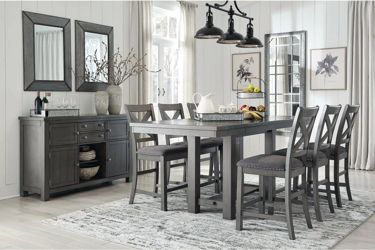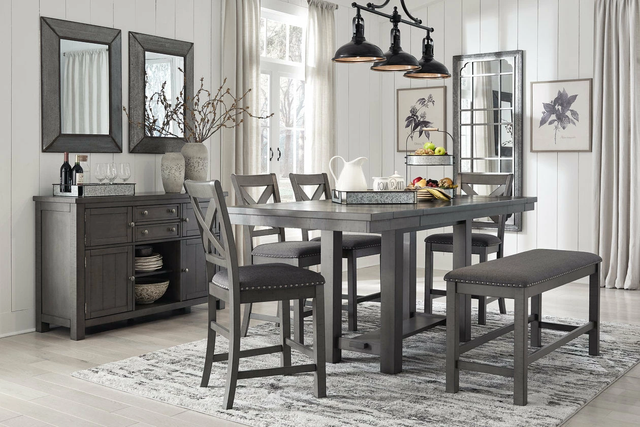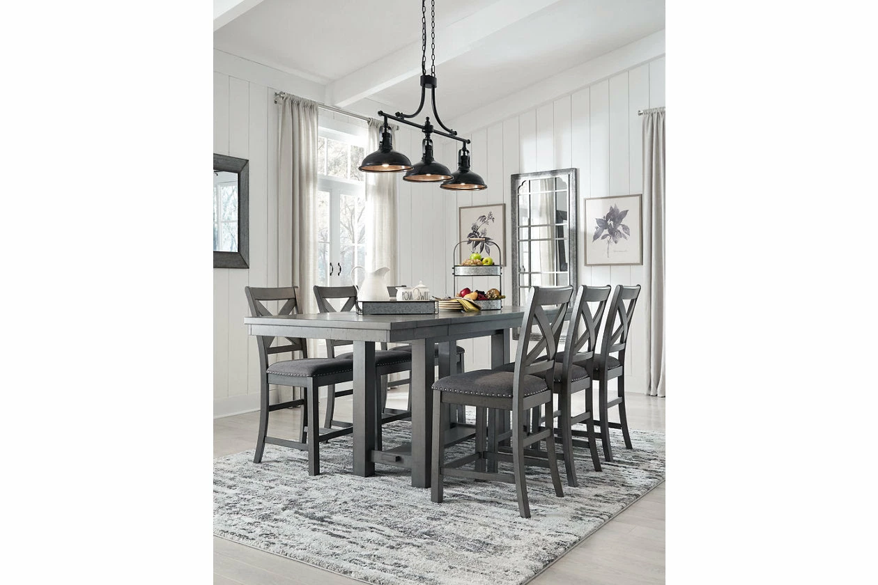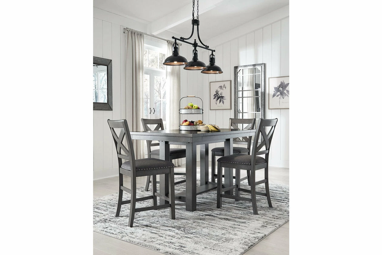 Going gray in the best possible way. This counter height bar stool package wows with an utterly on-trend smoky gray finish and X-back styling. Its softly cushioned seat with gray textured upholstery and nailhead trim will have you lingering a little longer at mealtime. Just a touch of distressing helps it fit right in with your modern farmhouse decor.