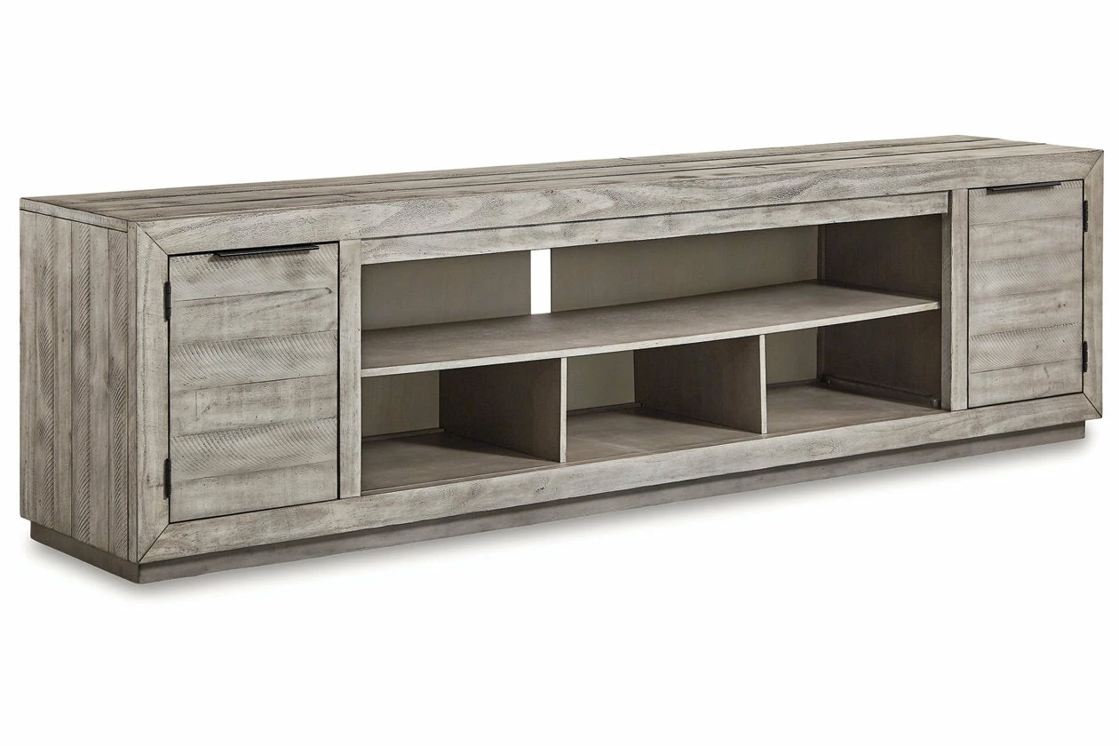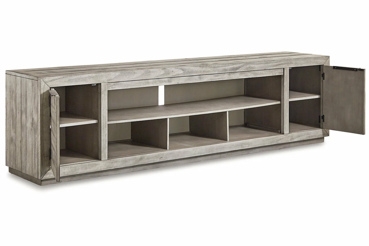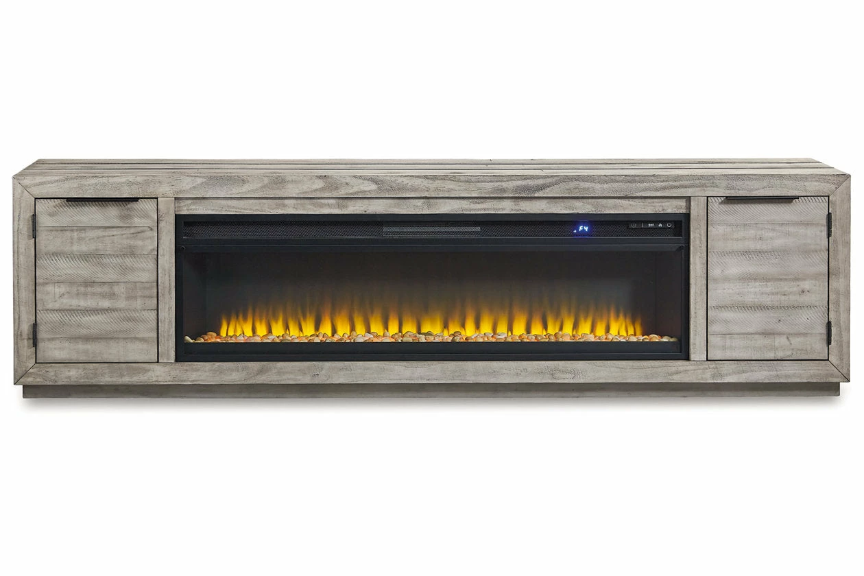 Balancing chic flair with a relaxed sensibility, this extra-large TV stand strikes just the right tone for rustic sophistication. Beautifully clean lines are subtly enhanced with relaxed distressing and saw marks for authentic barn wood character. Adding that much more show-stopping style is an LED fireplace insert that operates with or without heat. The fireplace insert comes with optional faux glass crystals and natural stones, so you can customize the look of the flame bed.
