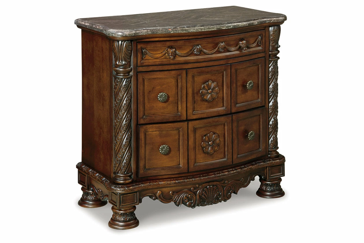 Inspired by the grandeur and grace of Old World style, this nightstand is nothing short of stunning. A choice blend of materials is accented by detailed ornamental appliques. The diamond-patterned marble veneer tops off the opulence. Three smooth-gliding drawers serve your bedside storage needs exceptionally well.