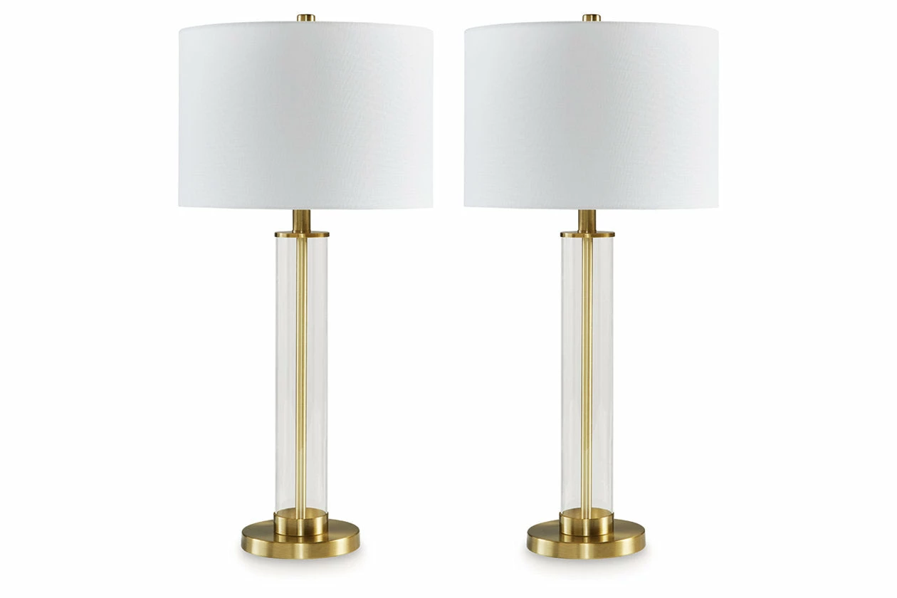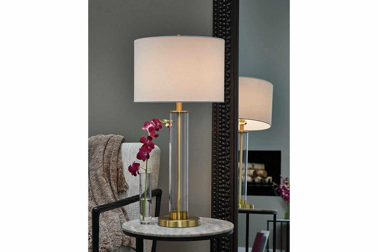 The body of this elegant table lamp has a contemporary flair, with a transparent glass cylinder that reveals a brass-tone rod inside. It’s a minimal design made for maximal illumination.