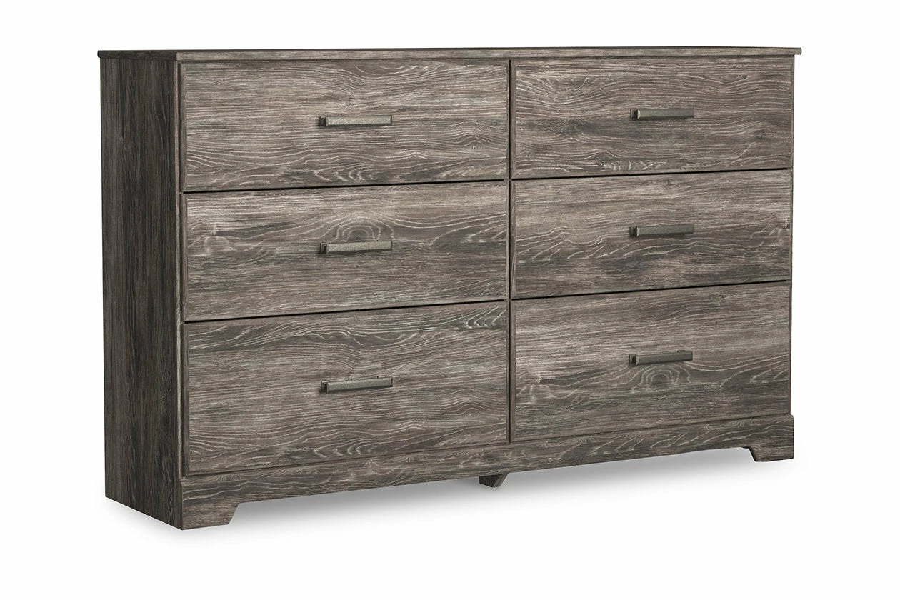 With its clean-lined look and modern attitude, this dresser is a fresh style awakening. A warm gray hue over replicated oak grain easily complements other furniture finishes. Smooth drawer fronts with antiqued pewter-tone handles complete the aesthetic.