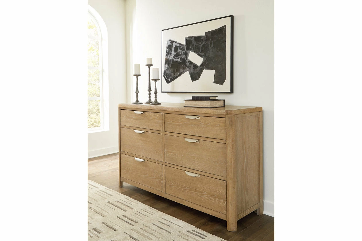 This dresser’s classic yet contemporary good looks are hard to deny. Softly shaped posts with a light oak finish and wire-brushed wood grain texture lend an organic appeal to your soothing space. Spacious drawers with fully finished interiors offer plenty of room to tuck away your wardrobe and spare bed linens.