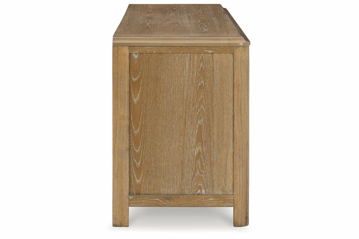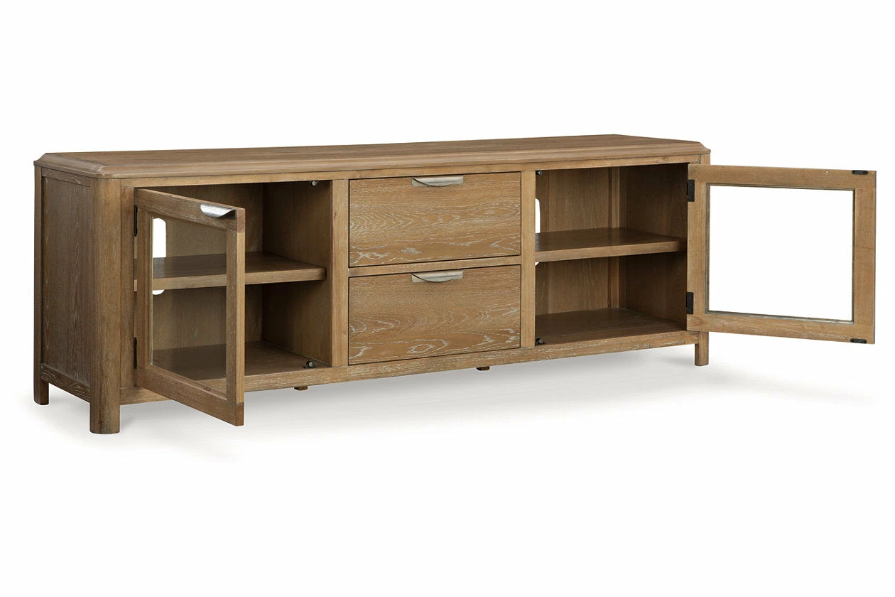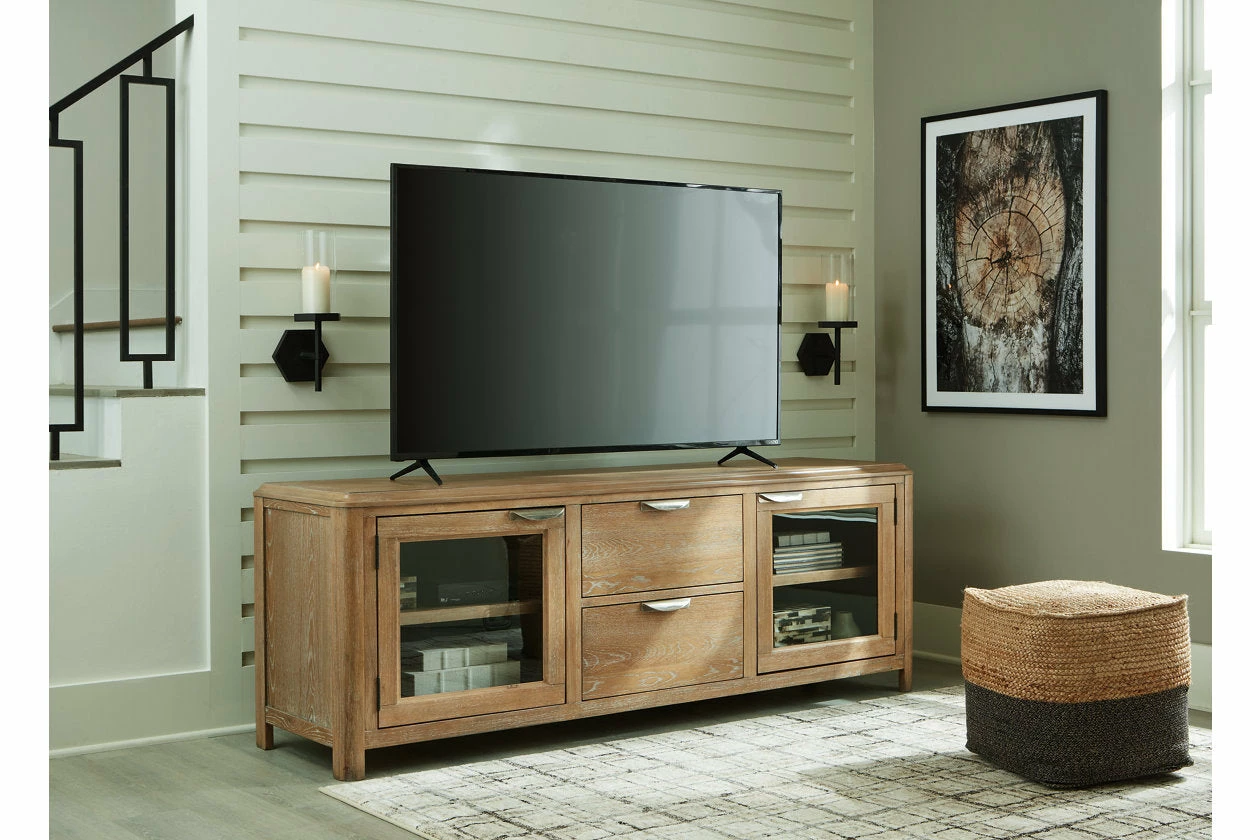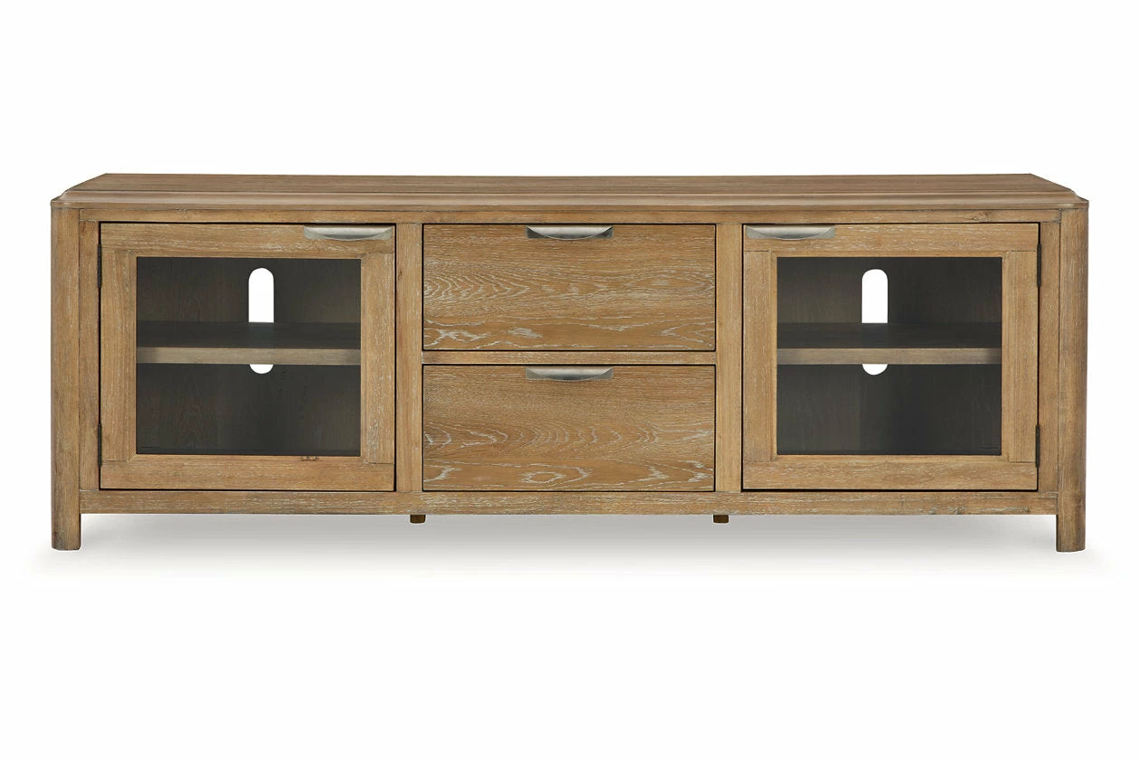 This TV stand’s classic yet contemporary good looks are hard to deny. Softly shaped posts with a light oak finish and wire-brushed wood grain texture lend an organic appeal to your entertainment space. Roomy drawers are just the ticket for extra media storage and keeping day-to-day clutter at bay, while the shelf is ideal for fashionable display pieces.