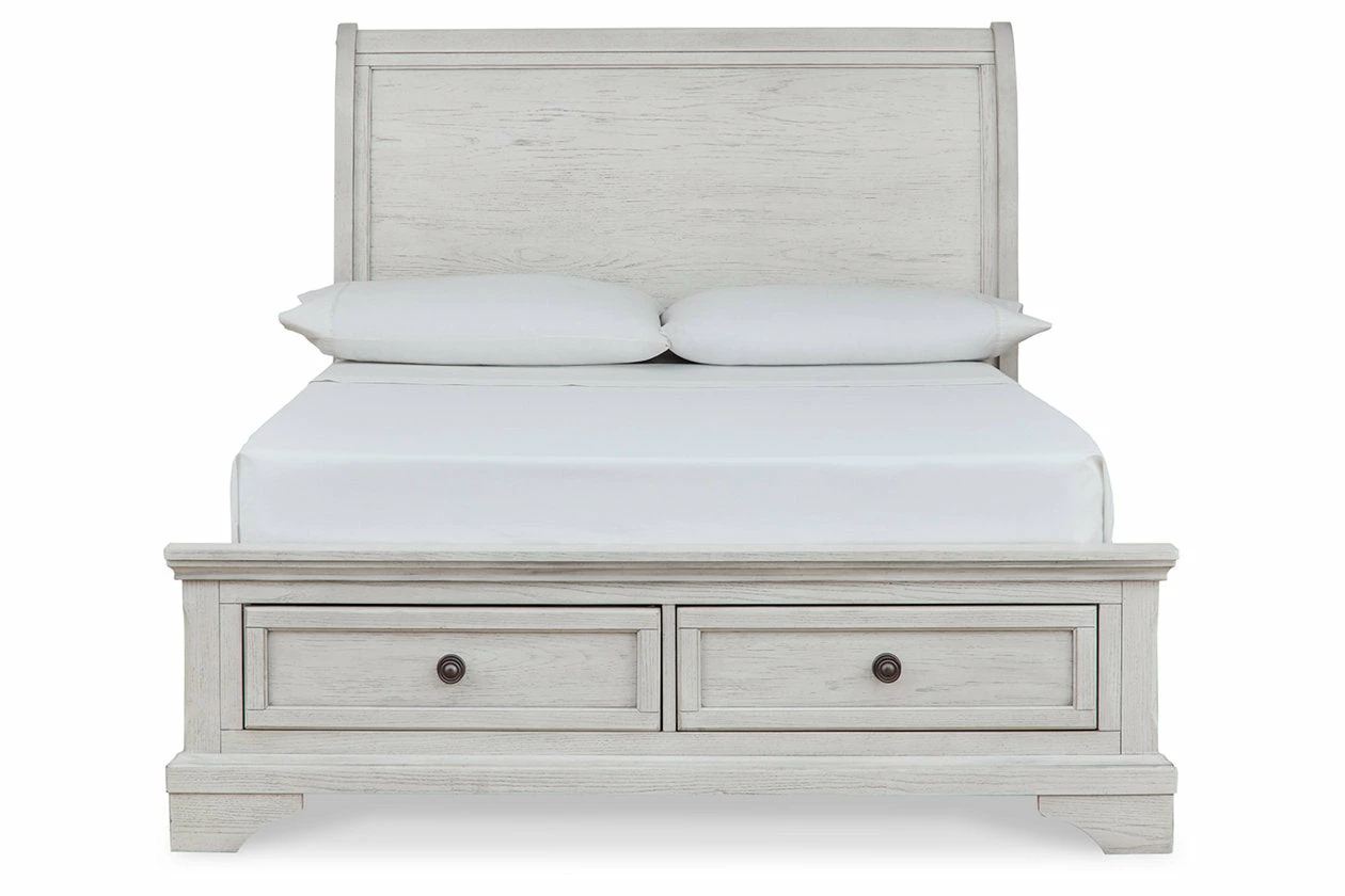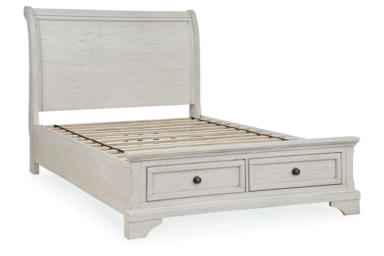 Elegant, timeless furnishings take your bedroom to the next level. Nothing does that better than this queen panel storage bed. The antiqued white finish with a wonderful grain texture radiates sophistication, while the dark bronze-tone hardware adds an ornate touch to the handy storage drawers.